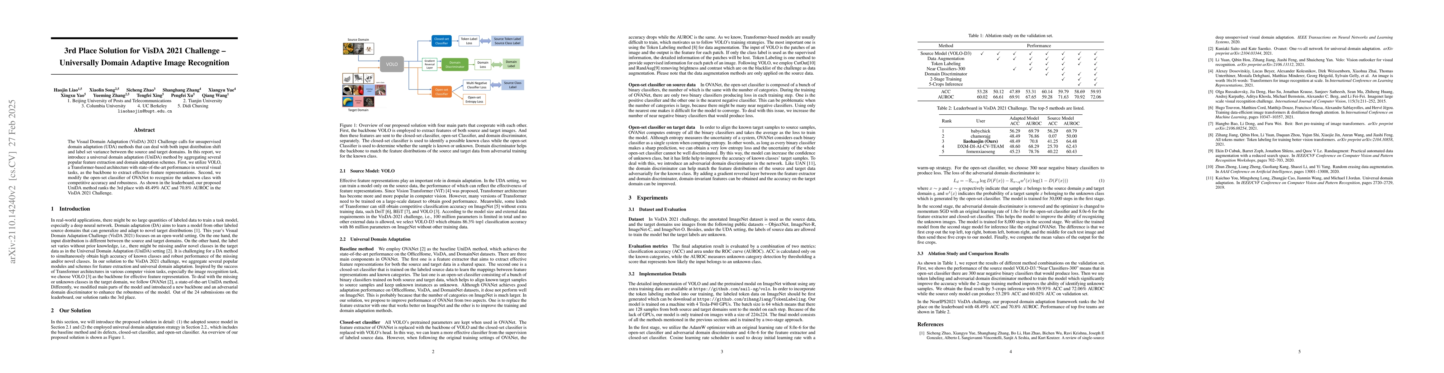 The Visual Domain Adaptation (VisDA) 2021 Challenge calls for unsupervised domain adaptation (UDA) methods that can deal with both input distribution shift and label set variance between the source and target domains. In this report, we introduce a universal domain adaptation (UniDA) method by aggregating several popular feature extraction and domain adaptation schemes. First, we utilize VOLO, a Transformer-based architecture with state-of-the-art performance in several visual tasks, as the backbone to extract effective feature representations. Second, we modify the open-set classifier of OVANet to recognize the unknown class with competitive accuracy and robustness. As shown in the leaderboard, our proposed UniDA method ranks the 2nd place with 48.56% ACC and 70.72% AUROC in the VisDA 2021 Challenge.