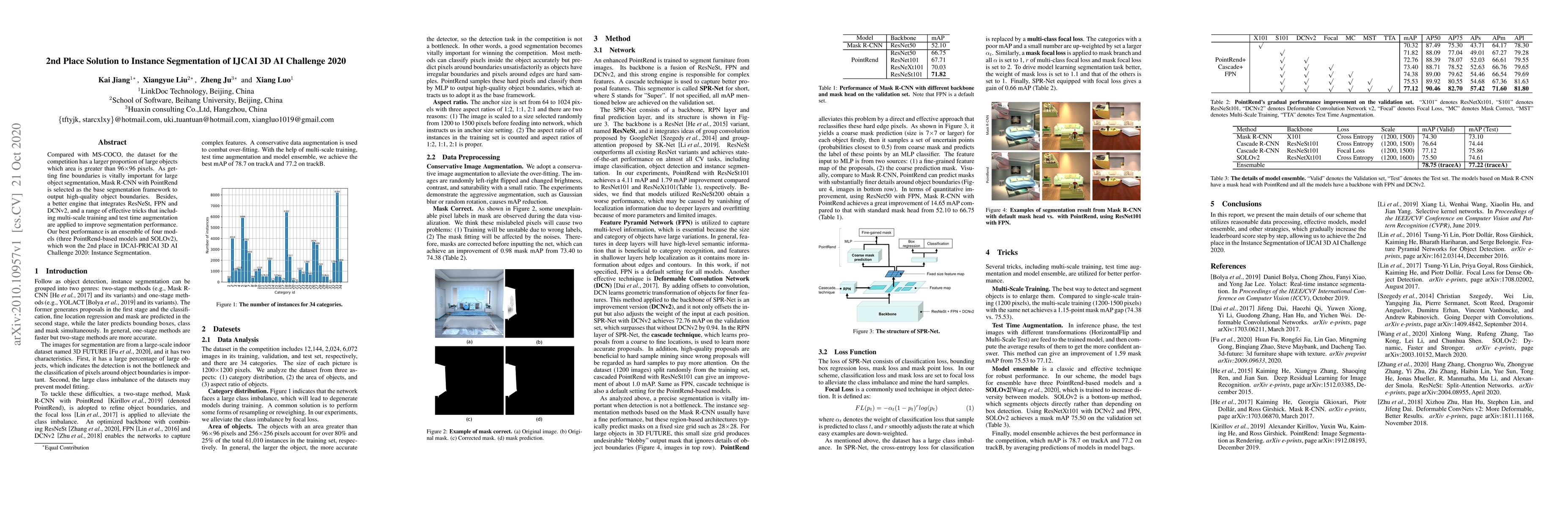 Compared with MS-COCO, the dataset for the competition has a larger proportion of large objects which area is greater than 96x96 pixels. As getting fine boundaries is vitally important for large object segmentation, Mask R-CNN with PointRend is selected as the base segmentation framework to output high-quality object boundaries. Besides, a better engine that integrates ResNeSt, FPN and DCNv2, and a range of effective tricks that including multi-scale training and test time augmentation are applied to improve segmentation performance. Our best performance is an ensemble of four models (three PointRend-based models and SOLOv2), which won the 2nd place in IJCAI-PRICAI 3D AI Challenge 2020: Instance Segmentation.