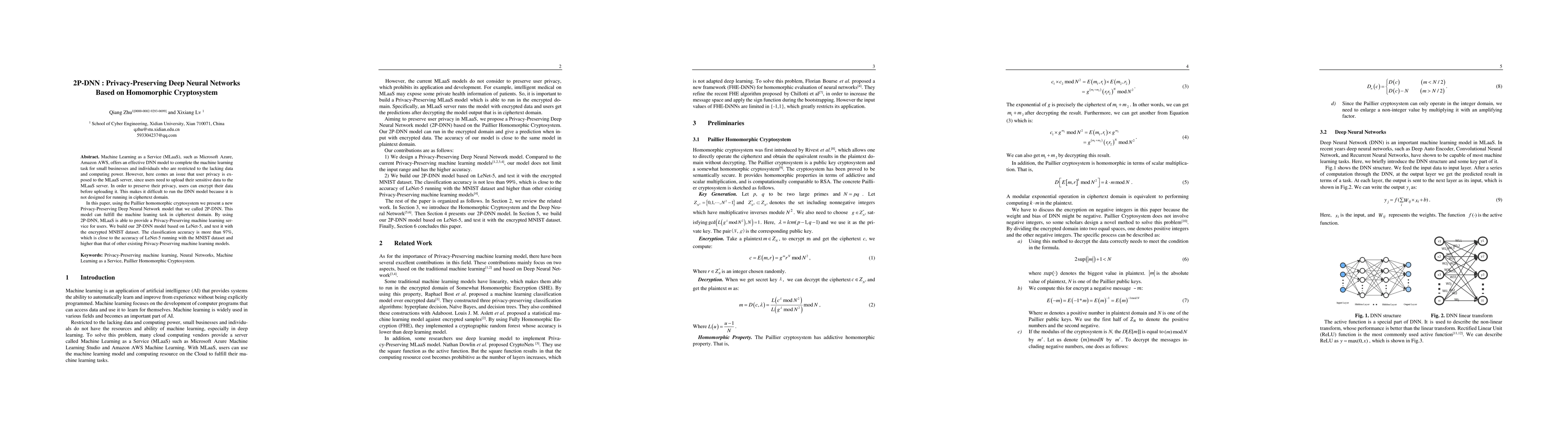 Machine Learning as a Service (MLaaS), such as Microsoft Azure, Amazon AWS, offers an effective DNN model to complete the machine learning task for small businesses and individuals who are restricted to the lacking data and computing power. However, here comes an issue that user privacy is ex-posed to the MLaaS server, since users need to upload their sensitive data to the MLaaS server. In order to preserve their privacy, users can encrypt their data before uploading it. This makes it difficult to run the DNN model because it is not designed for running in ciphertext domain. In this paper, using the Paillier homomorphic cryptosystem we present a new Privacy-Preserving Deep Neural Network model that we called 2P-DNN. This model can fulfill the machine leaning task in ciphertext domain. By using 2P-DNN, MLaaS is able to provide a Privacy-Preserving machine learning ser-vice for users. We build our 2P-DNN model based on LeNet-5, and test it with the encrypted MNIST dataset. The classification accuracy is more than 97%, which is close to the accuracy of LeNet-5 running with the MNIST dataset and higher than that of other existing Privacy-Preserving machine learning models