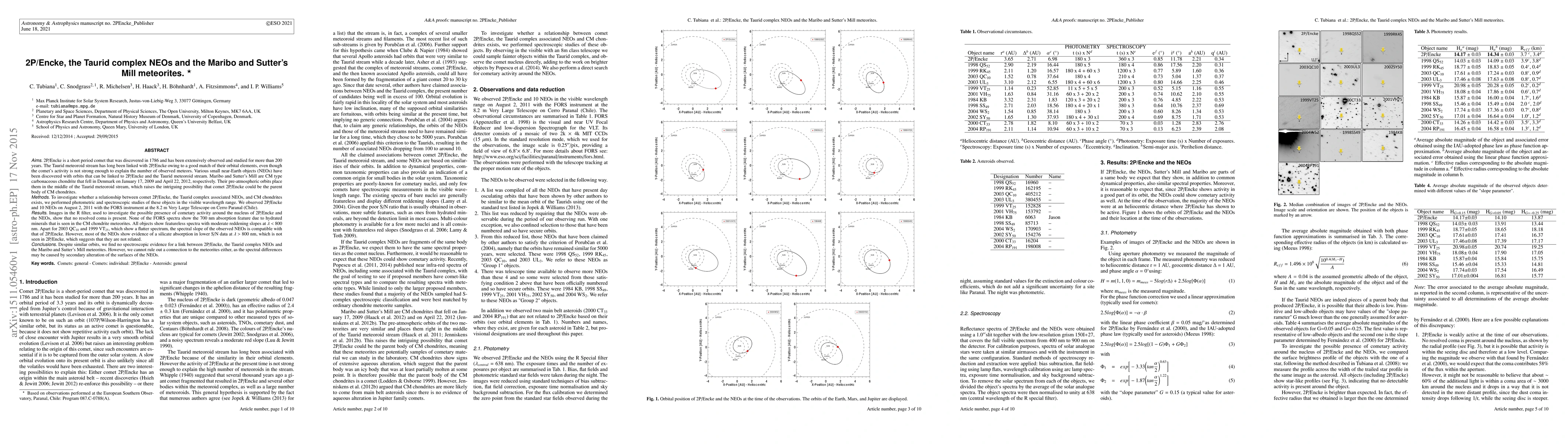 The study investigates a potential link between comet 2P/Encke, Taurid complex NEOs, and CM chondrites Maribo and Sutter's Mill through photometric and spectroscopic analysis. Despite similar orbits, no spectroscopic evidence supports a direct relationship between these objects, though secondary alteration of NEOs' surfaces may obscure such connections.