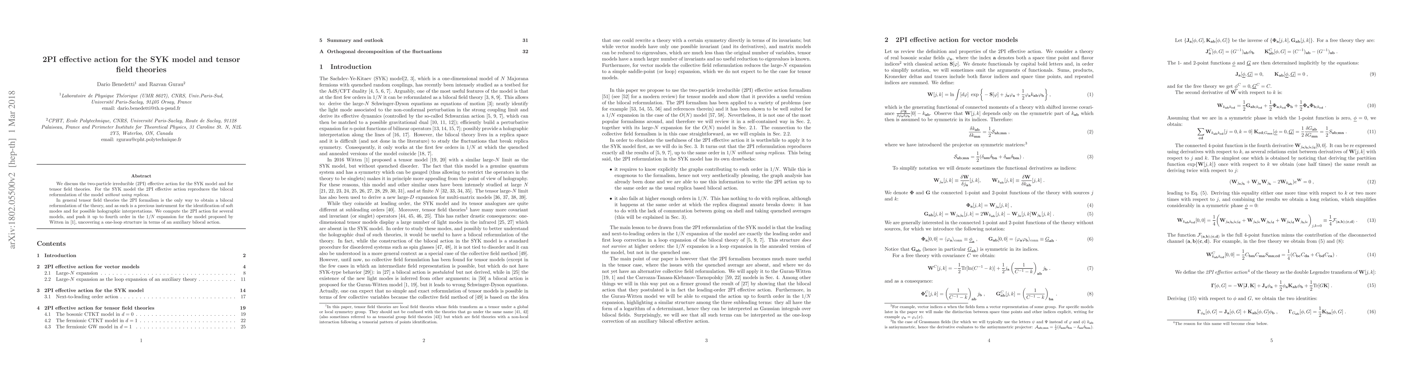 This paper explores the two-particle irreducible (2PI) effective action for the SYK model and tensor field theories, revealing its equivalence to the bilocal reformulation of the SYK model without replicas. It highlights the 2PI formalism's utility in identifying soft modes and facilitating holographic interpretations, and computes the 2PI action up to fourth order in the $1/N$ expansion for the SYK model, uncovering a one-loop structure in an auxiliary bilocal action.