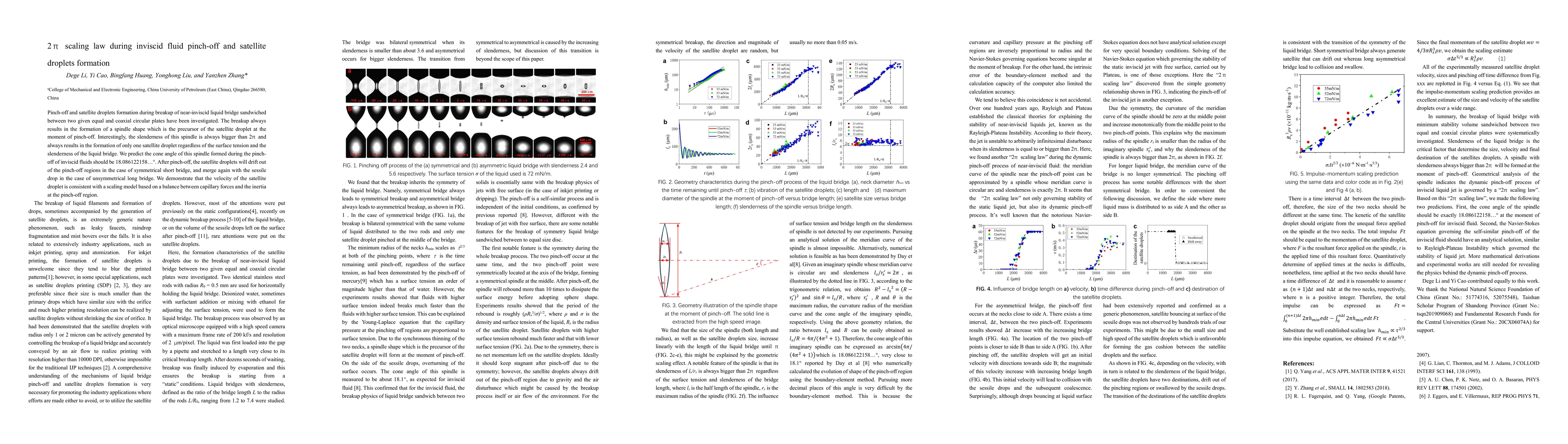 This research investigates the pinch-off and formation of satellite droplets in inviscid liquid bridges between coaxial circular plates, revealing a 2π scaling law for spindle slenderness resulting in a single satellite droplet and a cone angle of 18.086122158°. The satellite droplet's drift and merging behavior, along with its velocity, are consistent with a balance between capillary forces and inertia.