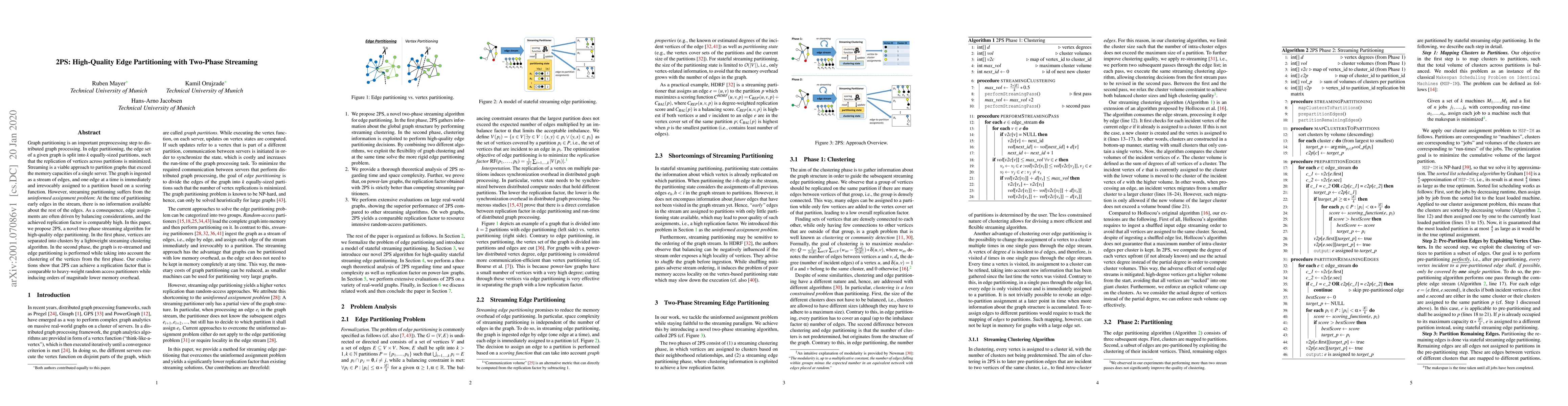 The paper proposes 2PS, a two-phase streaming algorithm for high-quality edge partitioning in large graphs, achieving lower replication and memory overhead compared to traditional methods by leveraging vertex clustering in the first phase to inform edge assignments in the second phase.