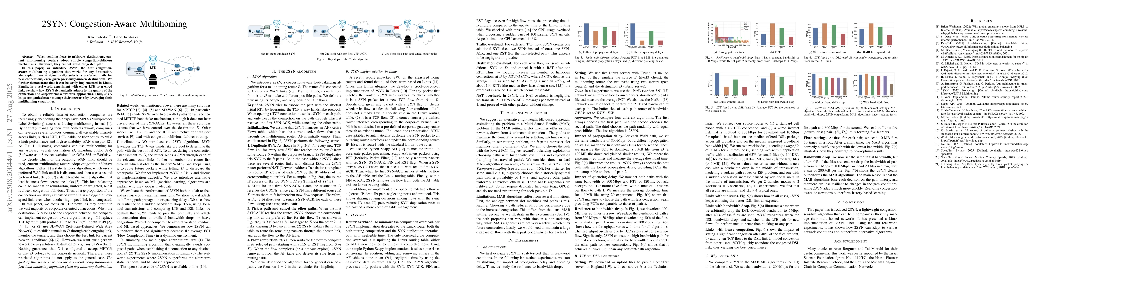 When sending flows to arbitrary destinations, current multihoming routers adopt simple congestion-oblivious mechanisms. Therefore, they cannot avoid congested paths. In this paper, we introduce 2SYN, the first congestion-aware multihoming algorithm that works for any destination. We explain how it dynamically selects a preferred path for new connections, even given previously-unseen destinations. We further demonstrate that it can be easily implemented in Linux. Finally, in a real-world experiment with either LTE or a wired link, we show how 2SYN dynamically adapts to the quality of the connection and outperforms alternative approaches. Thus, 2SYN helps companies better manage their networks by leveraging their multihoming capabilities.