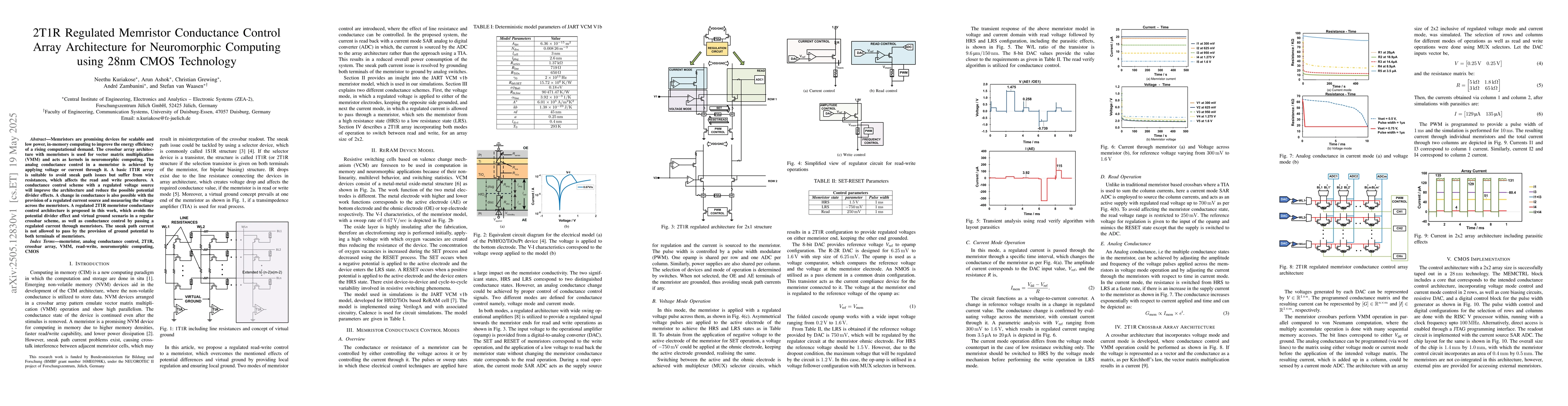 This work introduces a novel conductance control scheme using a regulated voltage and current source in a 2T1R configuration, distinguishing itself from previous 1T1R arrays by avoiding potential divider effects and sneak path currents.