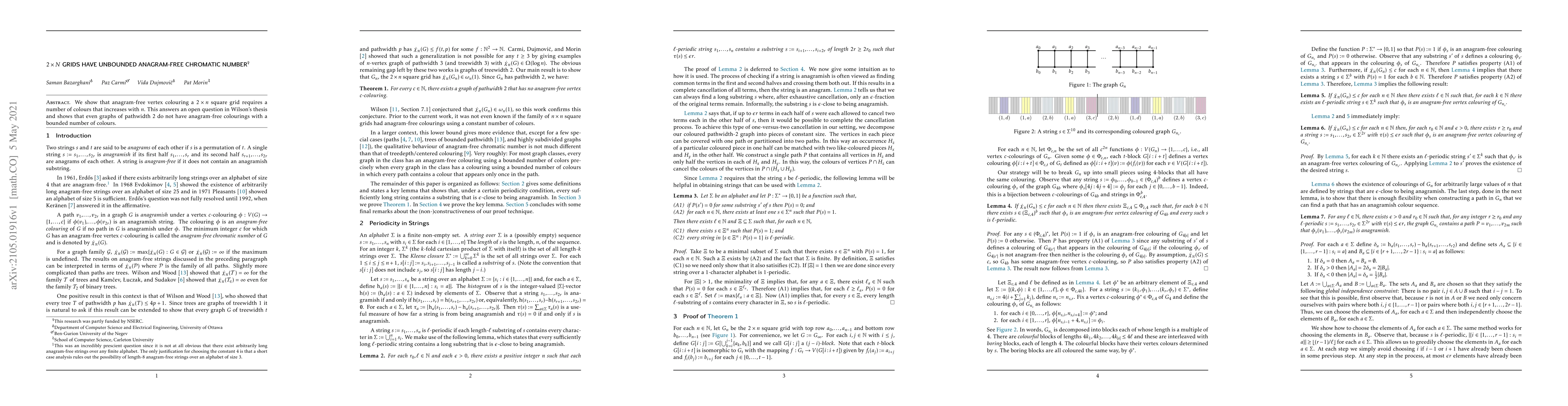 The paper demonstrates that anagram-free vertex colouring for $2\times n$ grids requires an increasing number of colours as $n$ grows, thus refuting the existence of a bounded anagram-free chromatic number for such grids. This resolves an open question posited in Wilson's thesis.