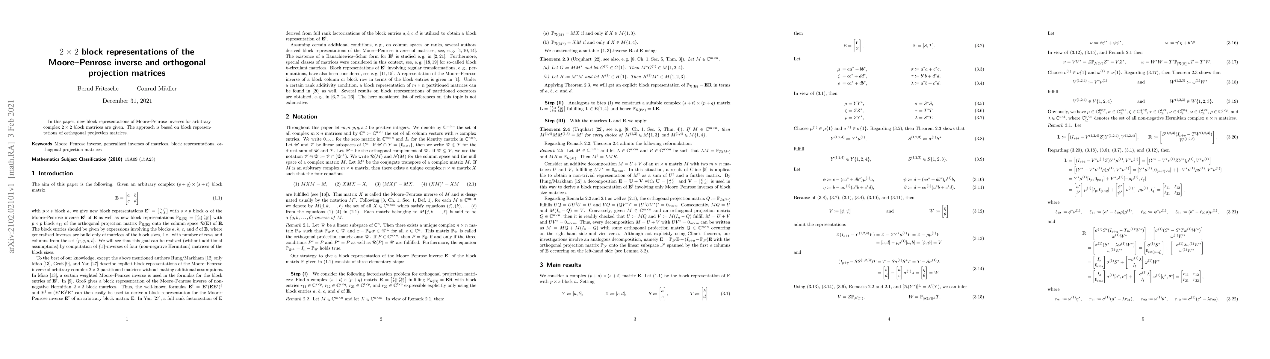Summary: This paper presents novel block representations of the Moore-Penrose inverse for $2\times2$ complex block matrices, utilizing the structure of orthogonal projection matrices to derive these representations.