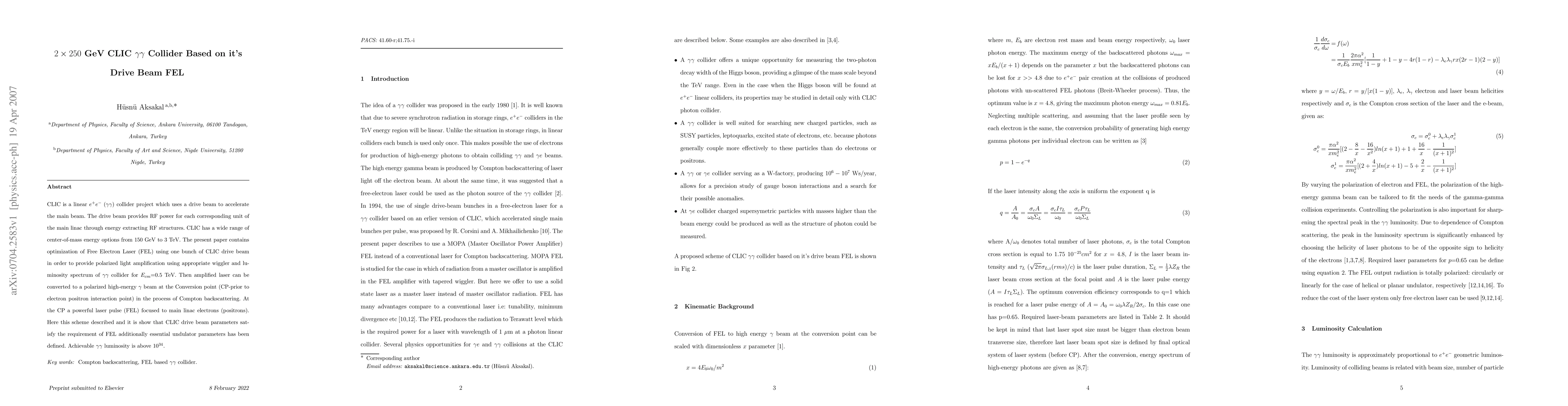 This paper optimizes the Free Electron Laser (FEL) using the CLIC drive beam to generate polarized light for a $2\times250$ GeV $\gamma\gamma$ collider, achieving a luminosity spectrum of $10^{34}$ cm$^{-2}$ s$^{-1}$ at 0.5 TeV center-of-mass energy. The FEL-amplified laser is converted to a polarized high-energy gamma beam via Compton backscattering.