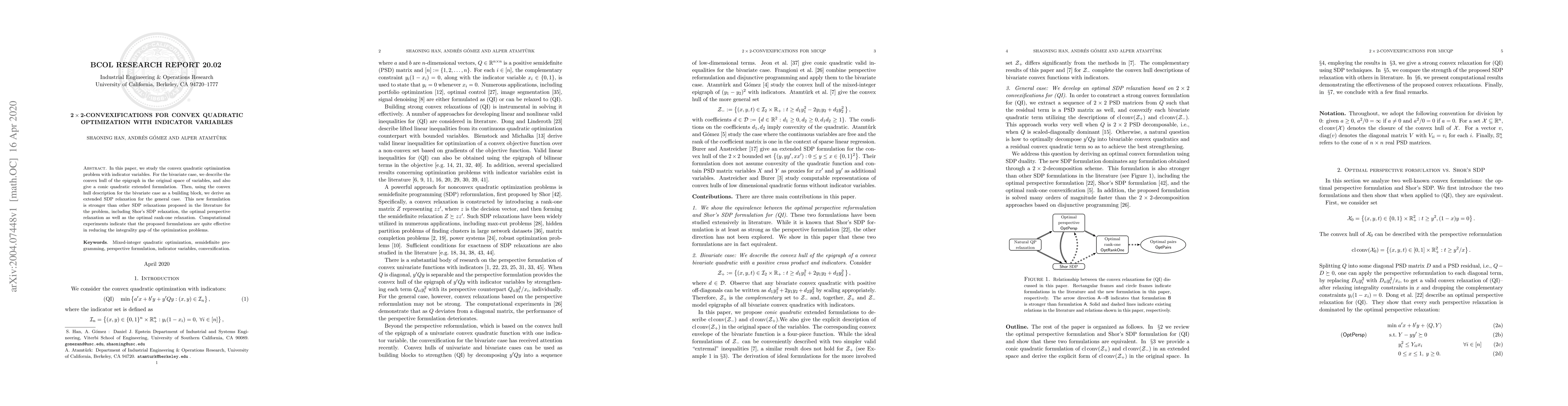 In this paper, we study the convex quadratic optimization problem with indicator variables. For the bivariate case, we describe the convex hull of the epigraph in the original space of variables, and also give a conic quadratic extended formulation. Then, using the convex hull description for the bivariate case as a building block, we derive an extended SDP relaxation for the general case. This new formulation is stronger than other SDP relaxations proposed in the literature for the problem, including Shor's SDP relaxation, the optimal perspective relaxation as well as the optimal rank-one relaxation. Computational experiments indicate that the proposed formulations are quite effective in reducing the integrality gap of the optimization problems.