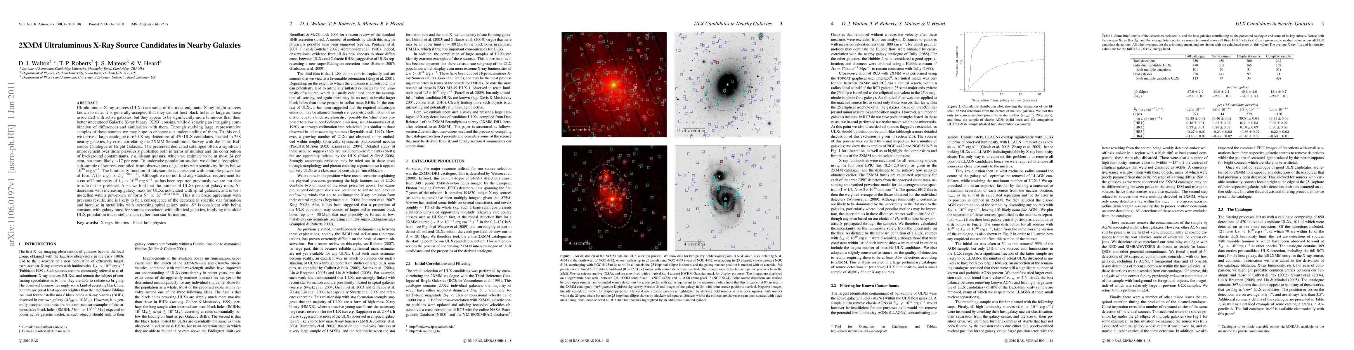 Ultraluminous X-ray sources (ULXs) are some of the most enigmatic X-ray bright sources known to date. It is generally accepted that they cannot host black holes as large as those associated with active galaxies, but they appear to be significantly more luminous than their better understood Galactic X-ray binary (XRB) cousins, while displaying an intriguing combination of differences and similarities with them. Through studying large, representative samples of these sources we may hope to enhance our understanding of them. To this end, we derive a large catalogue of 650 X-ray detections of 470 ULX candidates, located in 238 nearby galaxies, by cross correlating the 2XMM Serendipitous Survey with the Third Reference Catalogue of Bright Galaxies. The presented dedicated catalogue offers a significant improvement over those previously published both in terms of number and the contribution of background contaminants, e.g. distant quasars, which we estimate to be at most 24 per cent, but more likely ~17 per cent. To undertake population studies, we define a `complete' sub-sample of sources compiled from observations of galaxies with sensitivity limits below 10^39 erg/s. The luminosity function of this sample is consistent with a simple power-law. Although we do not find any statistical requirement for a high luminosity cut-off, as has been reported previously, we are not able to rule out its presence. Also, we find that the number of ULXs per unit galaxy mass decreases with increasing galaxy mass for ULXs associated with spiral galaxies, in broad agreement with previous results, but is consistent with being constant with galaxy mass for sources associated with elliptical galaxies.