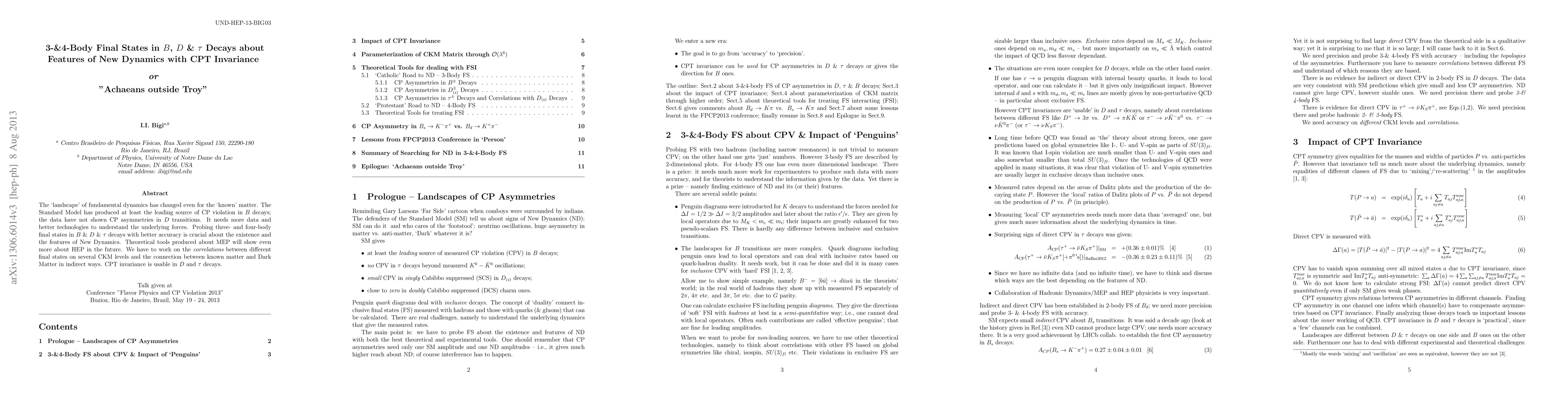 The 'landscape' of fundamental dynamics has changed even for the 'known' matter. The Standard Model has produced at least the leading source of CP violation (CPV) in B decays; the data have not shown CP asymmetries in $D$ transitions. It needs more data and better technologies to understand the underlying forces. Probing three- and four-body final states in $B$ & $D$ & $\tau$ decays with better accuracy is crucial about the existence and the features of New Dynamics. Theoretical tools produced about MEP will show even more about HEP in the future. We have to work on the {\em correlations} between different final states on several CKM levels and the connection between known matter and Dark Matter in indirect ways. CPT invariance is usable in $D$ and $\tau$ decays.
