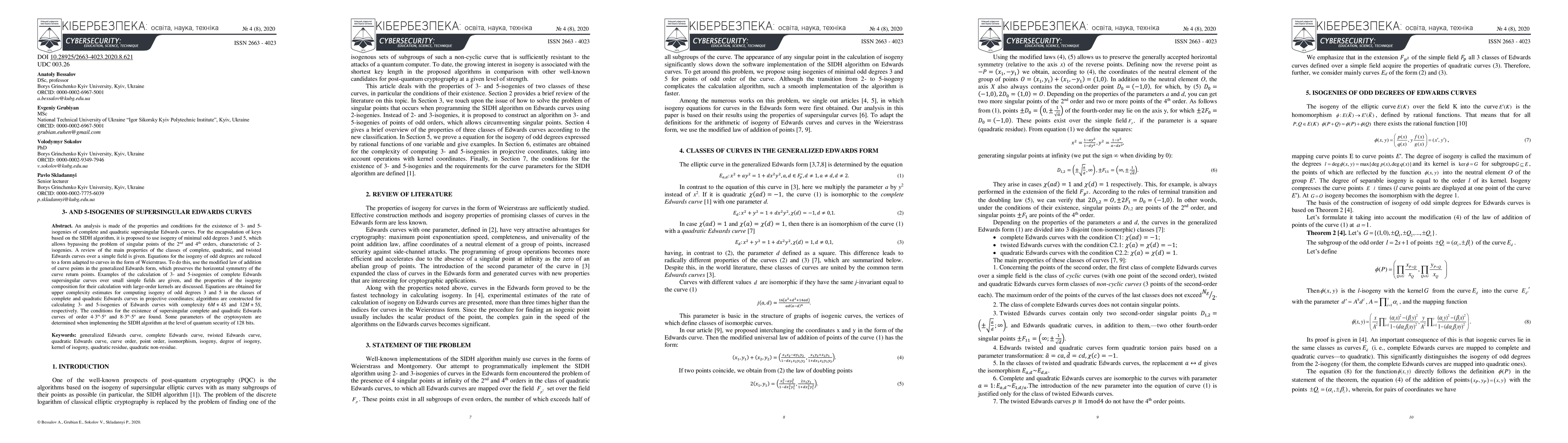 An analysis is made of the properties and conditions for the existence of 3- and 5-isogenies of complete and quadratic supersingular Edwards curves. For the encapsulation of keys based on the SIDH algorithm, it is proposed to use isogeny of minimal odd degrees 3 and 5, which allows bypassing the problem of singular points of the 2nd and 4th orders, characteristic of 2-isogenies. A review of the main properties of the classes of complete, quadratic, and twisted Edwards curves over a simple field is given. Equations for the isogeny of odd degrees are reduced to a form adapted to curves in the form of Weierstrass. To do this, use the modified law of addition of curve points in the generalized Edwards form, which preserves the horizontal symmetry of the curve return points. Examples of the calculation of 3- and 5-isogenies of complete Edwards supersingular curves over small simple fields are given, and the properties of the isogeny composition for their calculation with large-order kernels are discussed. Equations are obtained for upper complexity estimates for computing isogeny of odd degrees 3 and 5 in the classes of complete and quadratic Edwards curves in projective coordinates; algorithms are constructed for calculating 3- and 5-isogenies of Edwards curves with complexity 6M + 4S and 12M + 5S, respectively. The conditions for the existence of supersingular complete and quadratic Edwards curves of order 4x3mx5n and 8x3mx5n are found. Some parameters of the cryptosystem are determined when implementing the SIDH algorithm at the level of quantum security of 128 bits.