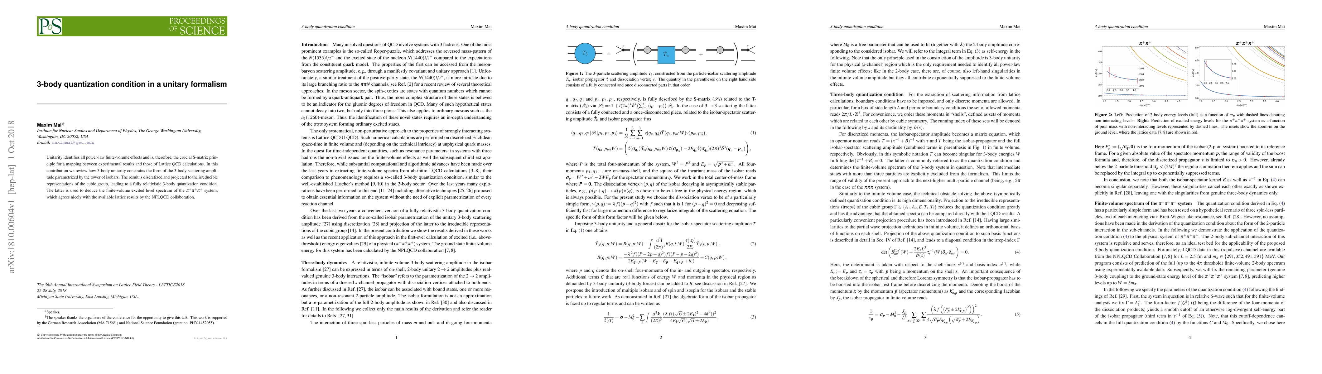 Unitarity identifies all power-law finite-volume effects and is, therefore, the crucial S-matrix principle for a mapping between experimental results and those of Lattice QCD calculations. In this contribution we review how 3-body unitarity constrains the form of the 3-body scattering amplitude parametrized by the tower of isobars. The result is discretized and projected to the irreducible representations of the cubic group, leading to a fully relativistic 3-body quantization condition. The latter is used to deduce the finite-volume excited level spectrum of the $\pi^+\pi^+\pi^+$ system, which agrees nicely with the available lattice results by the NPLQCD collaboration.