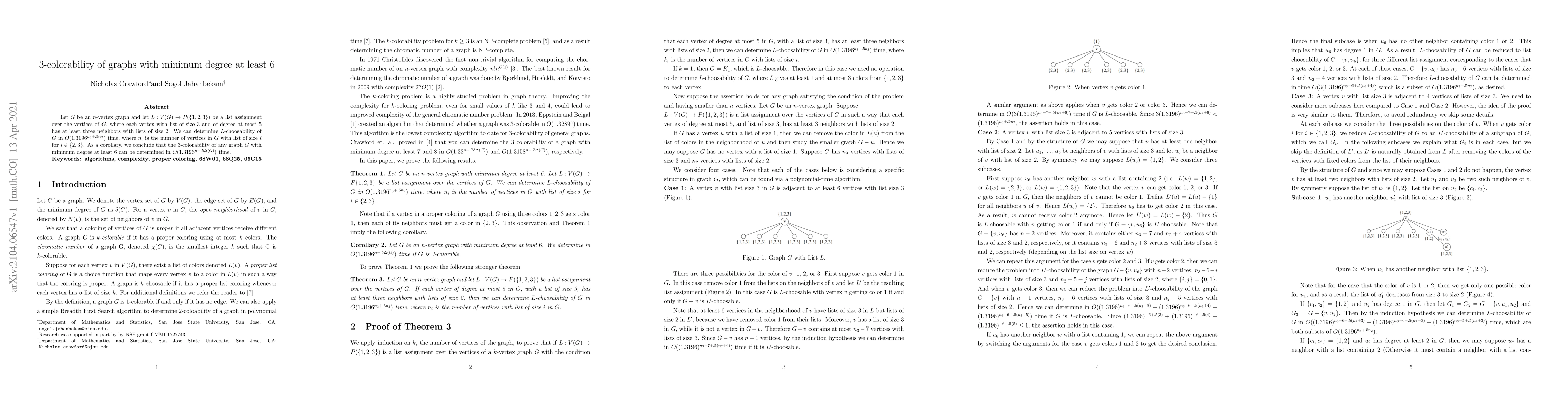 Let $G$ be an $n$-vertex graph and let $L:V(G)\rightarrow P(\{1,2,3\})$ be a list assignment over the vertices of $G$, where each vertex with list of size 3 and of degree at most 5 has at least three neighbors with lists of size 2. We can determine $L$-choosability of $G$ in $O(1.3196^{n_3+.5n_2})$ time, where $n_i$ is the number of vertices in $G$ with list of size $i$ for $i\in \{2,3\}$. As a corollary, we conclude that the 3-colorability of any graph $G$ with minimum degree at least 6 can be determined in $O(1.3196^{n-.5\Delta(G)})$ time.