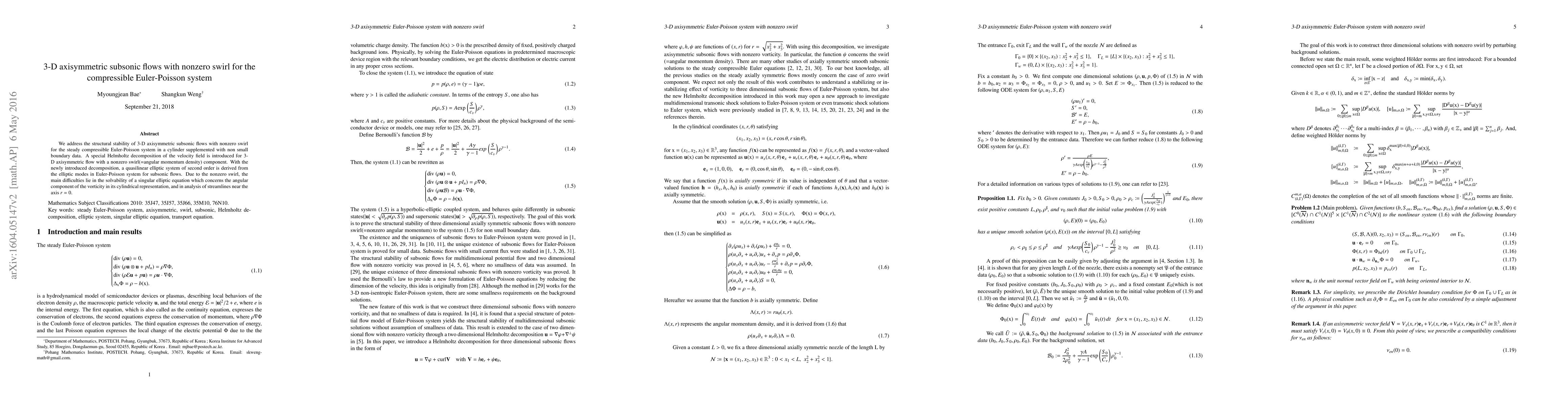 We address the structural stability of 3-D axisymmetric subsonic flows with nonzero swirl for the steady compressible Euler-Poisson system in a cylinder supplemented with non small boundary data. A special Helmholtz decomposition of the velocity field is introduced for 3-D axisymmetric flow with a nonzero swirl(=angular momentum density) component. With the newly introduced decomposition, a quasilinear elliptic system of second order is derived from the elliptic modes in Euler-Poisson system for subsonic flows. Due to the nonzero swirl, the main difficulties lie in the solvability of a singular elliptic equation which concerns the angular component of the vorticity in its cylindrical representation, and in analysis of streamlines near the axis $r=0$.