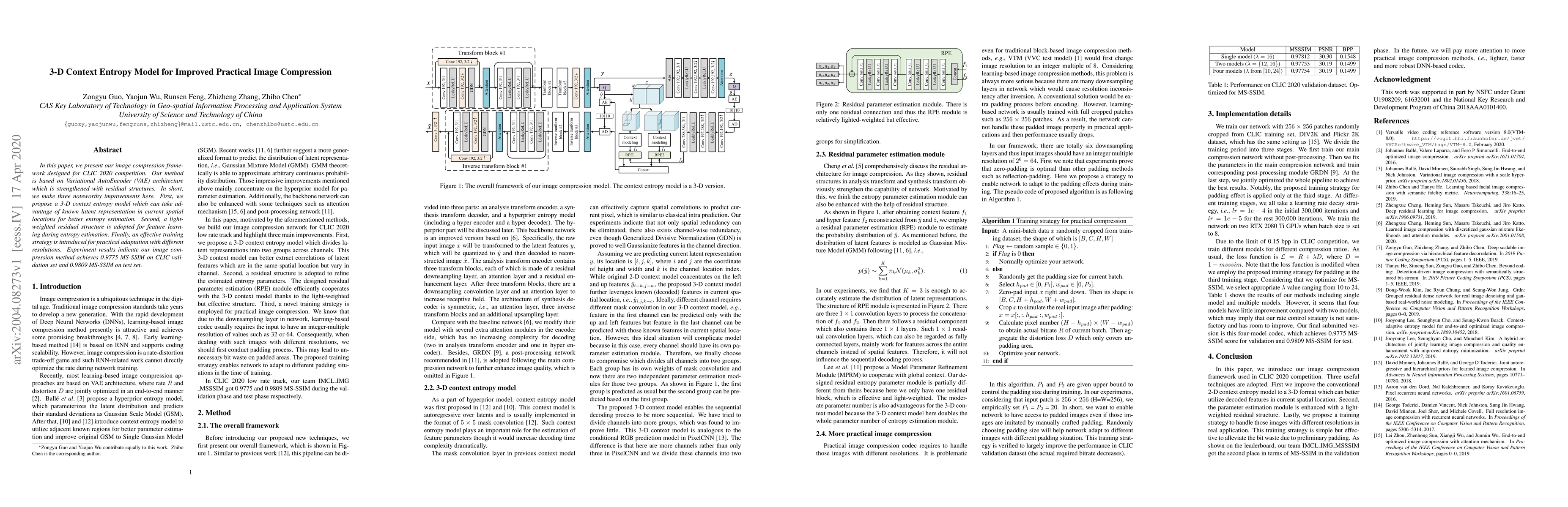 This paper proposes a new image compression framework that achieves high-quality compression using a 3-D context entropy model with residual structures. It results in improved MS-SSIM scores of 0.9775 and 0.9809 on validation and test sets, respectively.
