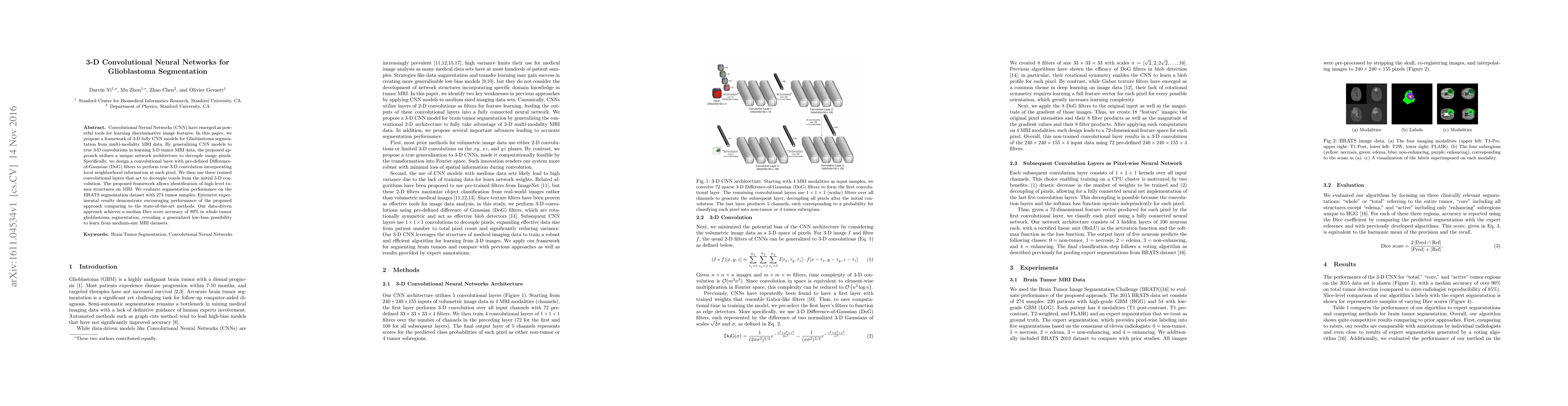 This paper proposes a 3-D convolutional neural network framework for segmenting glioblastoma in multi-modality MRI data, utilizing a unique network architecture with 3-D convolutions and Difference-of-Gaussian filters. The method achieves a median Dice score accuracy of 89% on the BRATS dataset, outperforming state-of-the-art methods.