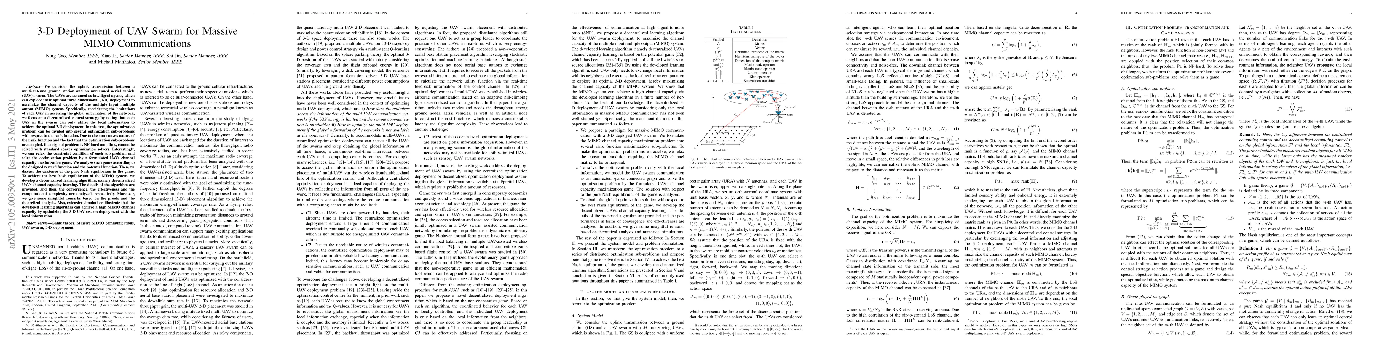 Researchers propose a decentralized control strategy for 3D deployment of UAV swarms to maximize MIMO channel capacity in massive communication systems. They develop a learning algorithm that can achieve high channel capacity through local information optimization.