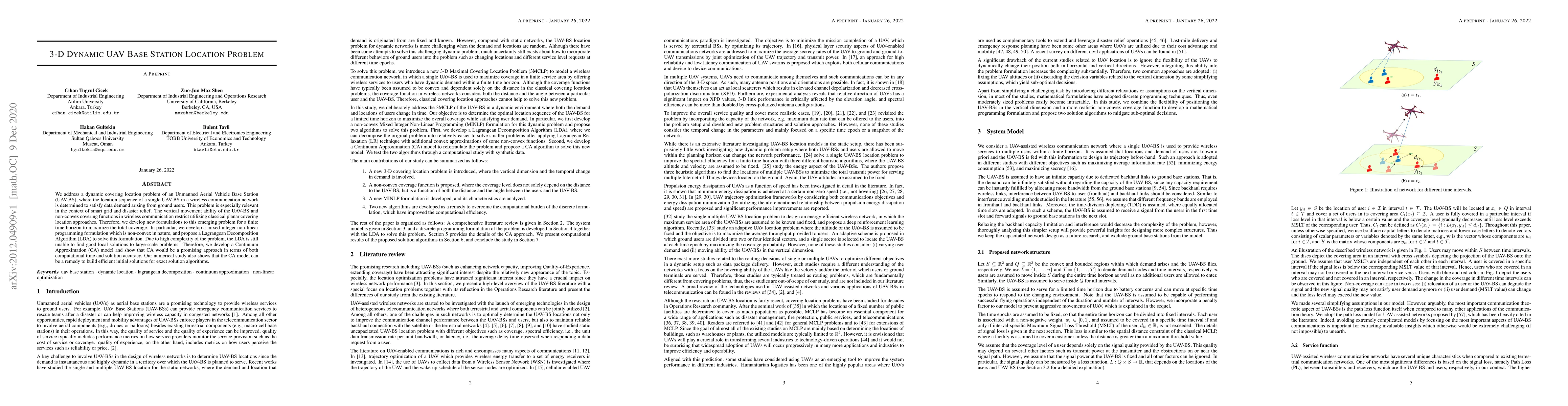 This paper tackles the dynamic location problem of a UAV-based base station to maximize coverage for ground users, developing a mixed-integer non-linear programming formulation and a Lagrangean Decomposition Algorithm. A Continuum Approximation model is proposed to address the high complexity and computational challenges, showing promise in both efficiency and solution accuracy.