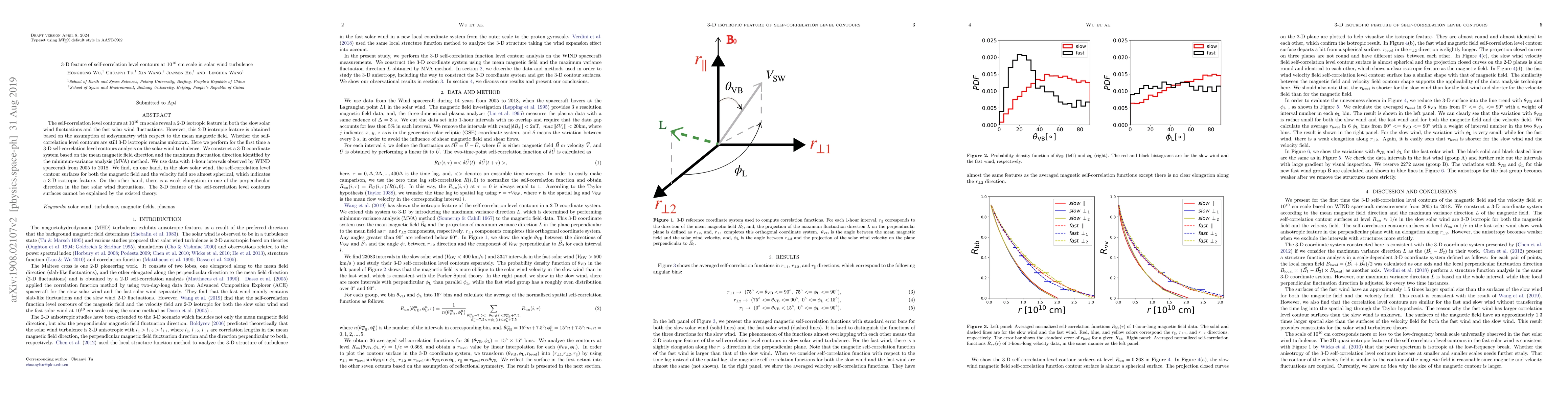 Researchers analyzed solar wind turbulence data to identify 3-D features of self-correlation level contours, finding that slow solar wind fluctuations exhibit 3-D isotropy but fast solar wind fluctuations show a weak elongation in one direction.
