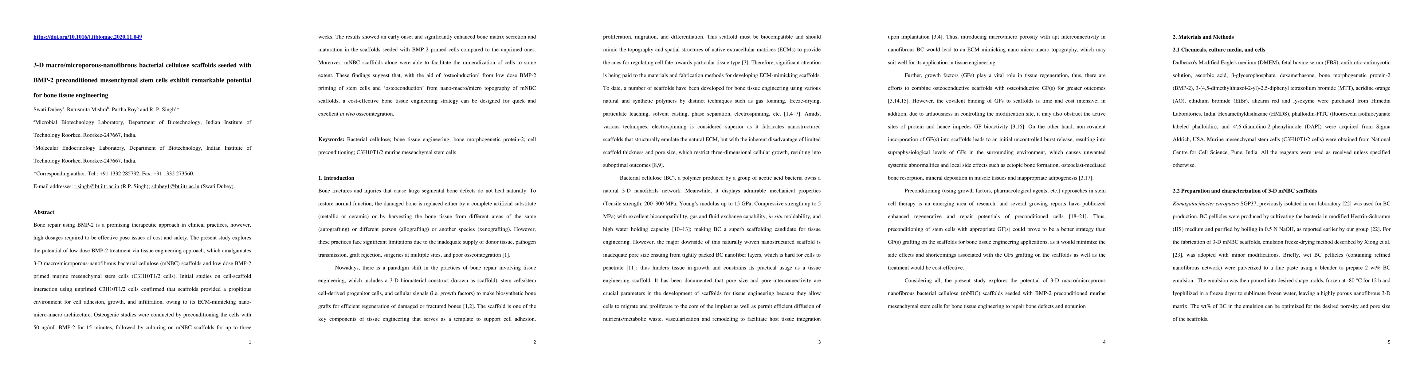 This study investigates the use of low-dose BMP-2 preconditioned mesenchymal stem cells seeded on 3-D macro/microporous-nanofibrous bacterial cellulose scaffolds for bone tissue engineering, demonstrating enhanced bone matrix secretion and mineralization compared to unprimed cells. The scaffolds provide a conducive environment for cell growth and osteointegration.