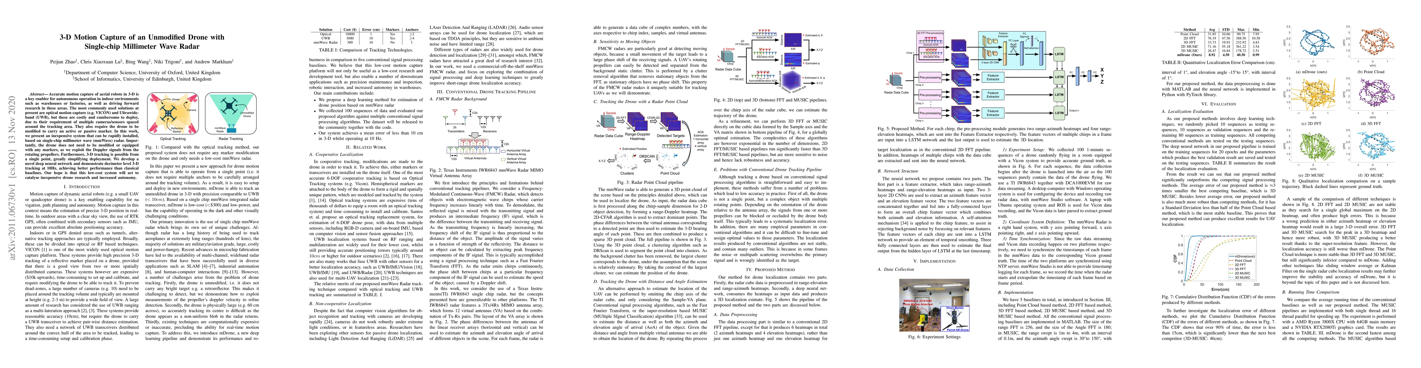 This paper presents an inexpensive 3-D motion capture system for drones using single-chip millimeter wave radar, eliminating the need for drone modifications or markers. The system achieves decimeter-level tracking with a novel deep neural network, offering a cost-effective alternative to optical and UWB systems.