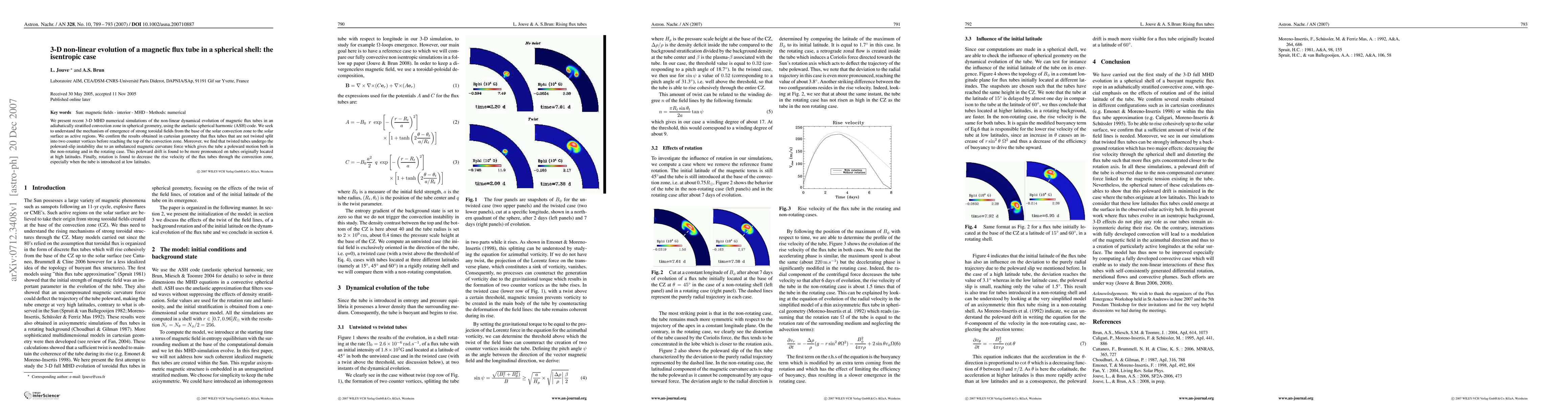 This paper uses 3-D MHD simulations to study the non-linear evolution of magnetic flux tubes in a spherical shell, confirming that untwisted tubes split into counter vortices and twisted tubes experience poleward drift due to magnetic curvature forces, with rotation slowing the rise velocity, particularly for low-latitude tubes.