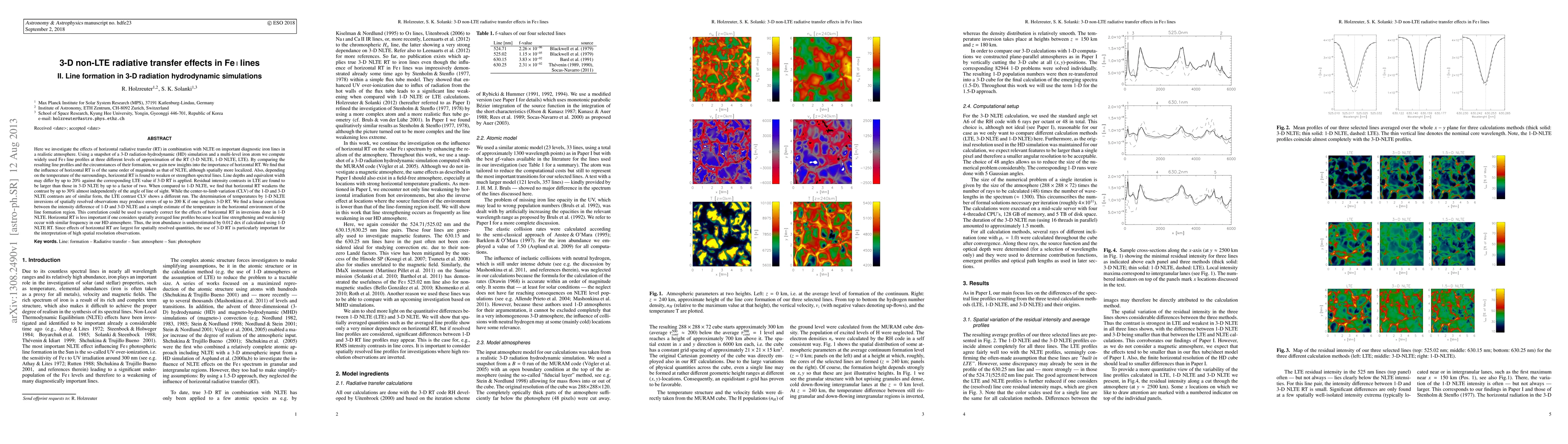 We investigate the effects of horizontal radiative transfer (RT) a NLTE on important diagnostic iron lines in a realistic 3-D HD simulation. Using a multi-level atom we compute and compare widely used Fe I line profiles at 3 different levels of approximation (3-D NLTE, 1-D NLTE, LTE). We find that the influence of horizontal RT is of the same order of magnitude as that of NLTE, although spatially more localized. Also, depending on the temperature of the surroundings, horizontal RT is found to weaken or strengthen spectral lines. Line depths and equivalent width may differ by up to 20% against the corresponding LTE value if 3-D RT is applied. Residual intensity contrasts in LTE are found to be larger than those in 3-D NLTE by up to a factor of two. When compared to 1-D NLTE, we find that horizontal RT weakens the contrast by up to 30% almost independently of the angle of line of sight. While the CLV of the 1-D and 3-D NLTE contrasts are of similar form, the LTE contrast CLV shows a different run. The determination of temperatures by 1-D NLTE inversions of spatially resolved observations may produce errors of up to 200 K if one neglects 3-D RT. We find a linear correlation between the intensity difference of 1-D and 3-D NLTE and a simple estimate of the temperature in the horizontal environment of the line formation region. This correlation could be used to coarsely correct for the effects of horizontal RT in inversions done in 1-D NLTE. Horizontal RT is less important if one considers spatially averaged line profiles because local line strengthening and weakening occur with similar frequency in our HD atmosphere. Thus, the iron abundance is underestimated by 0.012 dex if calculated using 1-D NLTE RT. Since effects of horizontal RT are largest for spatially resolved quantities, the use of 3-D RT is particularly important for the interpretation of high spatial resolution observations.