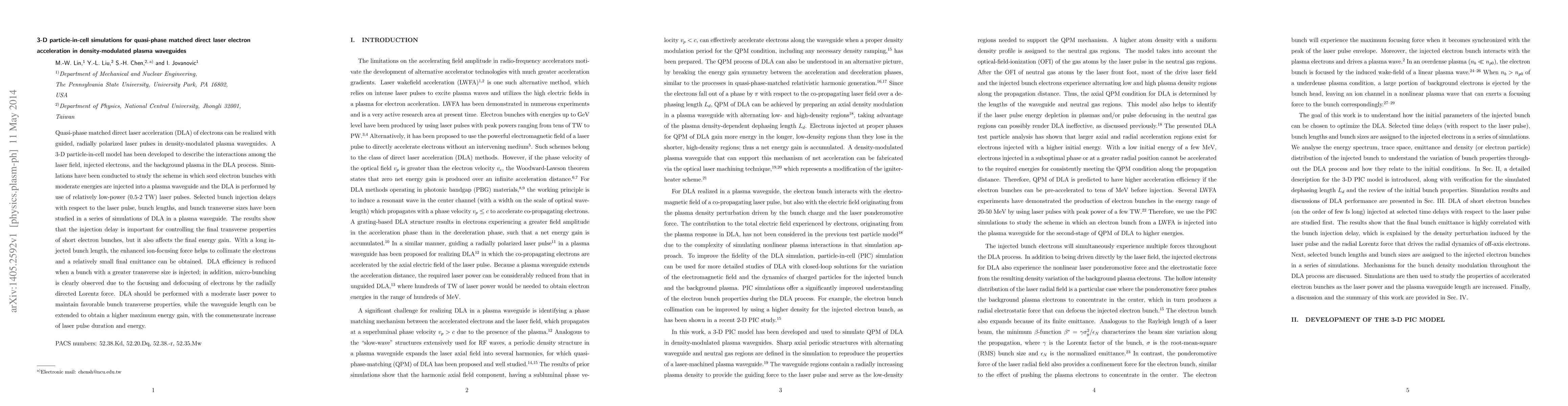Quasi-phase matched direct laser acceleration (DLA) of electrons can be realized with guided, radially polarized laser pulses in density-modulated plasma waveguides. A 3-D particle-in-cell model has been developed to describe the interactions among the laser field, injected electrons, and the background plasma in the DLA process. Simulations have been conducted to study the scheme in which seed electron bunches with moderate energies are injected into a plasma waveguide and the DLA is performed by use of relatively low-power (0.5-2 TW) laser pulses. Selected bunch injection delays with respect to the laser pulse, bunch lengths, and bunch transverse sizes have been studied in a series of simulations of DLA in a plasma waveguide. The results show that the injection delay is important for controlling the final transverse properties of short electron bunches, but it also affects the final energy gain. With a long injected bunch length, the enhanced ion-focusing force helps to collimate the electrons and a relatively small final emittance can be obtained. DLA efficiency is reduced when a bunch with a greater transverse size is injected; in addition, micro-bunching is clearly observed due to the focusing and defocusing of electrons by the radially directed Lorentz force. DLA should be performed with a moderate laser power to maintain favorable bunch transverse properties, while the waveguide length can be extended to obtain a higher maximum energy gain, with the commensurate increase of laser pulse duration and energy.