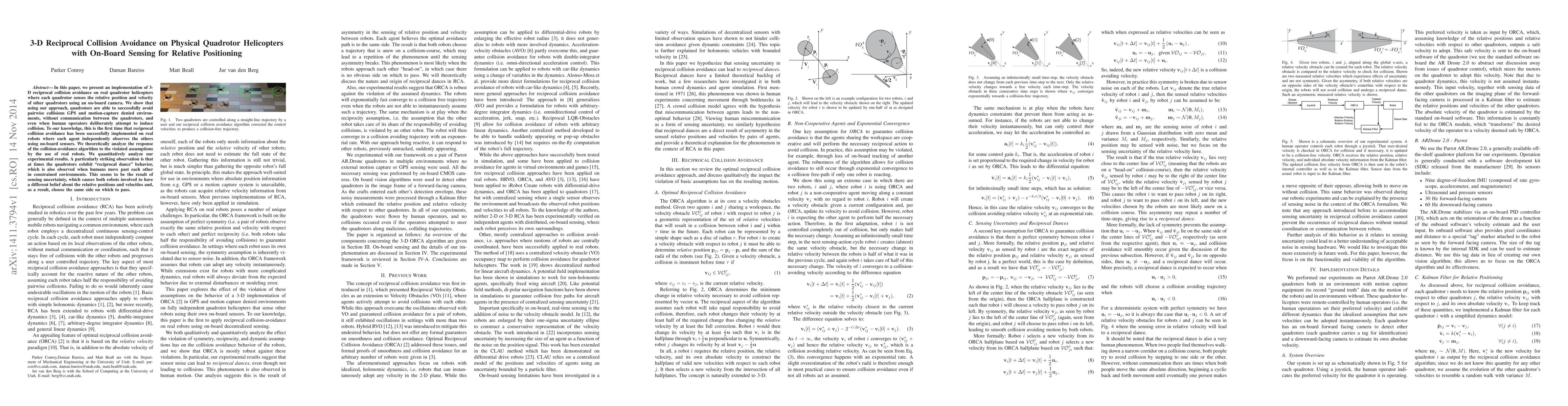 Researchers successfully implemented 3D reciprocal collision avoidance on quadrotor helicopters using on-board cameras without communication between the drones. They observed a 'reciprocal dance' behavior, where drones pass each other in a synchronized manner due to sensing uncertainty.