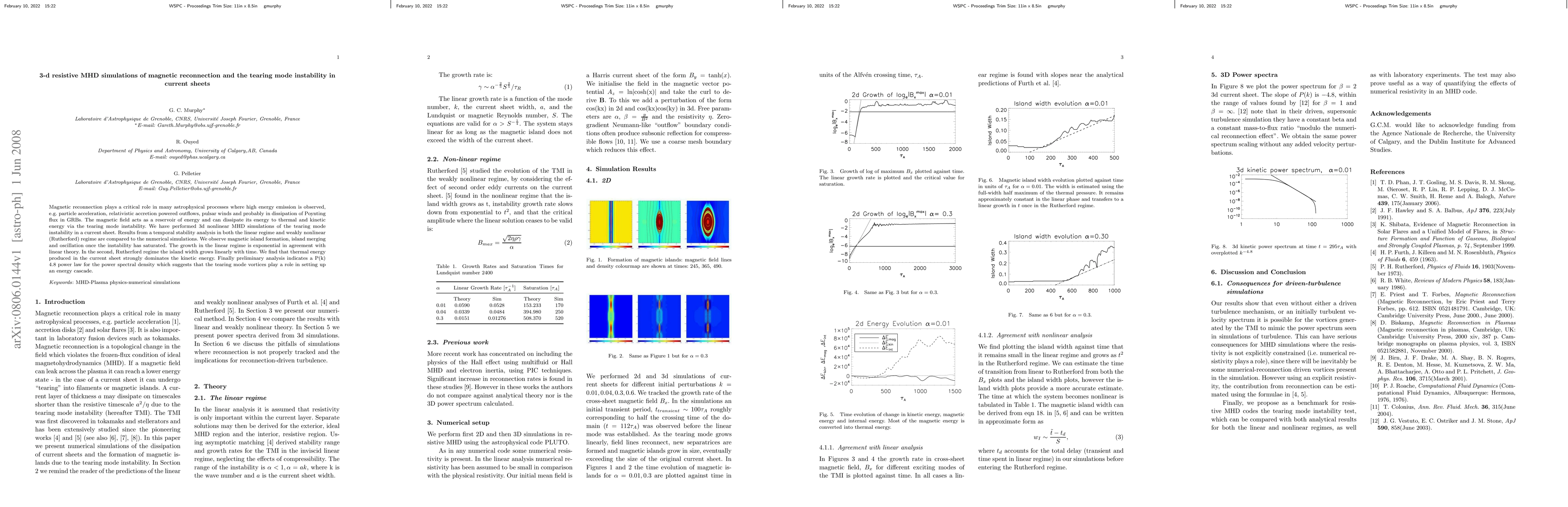 Magnetic reconnection plays a critical role in many astrophysical processes where high energy emission is observed, e.g. particle acceleration, relativistic accretion powered outflows, pulsar winds and probably in dissipation of Poynting flux in GRBs. The magnetic field acts as a reservoir of energy and can dissipate its energy to thermal and kinetic energy via the tearing mode instability. We have performed 3d nonlinear MHD simulations of the tearing mode instability in a current sheet. Results from a temporal stability analysis in both the linear regime and weakly nonlinear (Rutherford) regime are compared to the numerical simulations. We observe magnetic island formation, island merging and oscillation once the instability has saturated. The growth in the linear regime is exponential in agreement with linear theory. In the second, Rutherford regime the island width grows linearly with time. We find that thermal energy produced in the current sheet strongly dominates the kinetic energy. Finally preliminary analysis indicates a P(k) 4.8 power law for the power spectral density which suggests that the tearing mode vortices play a role in setting up an energy cascade.
