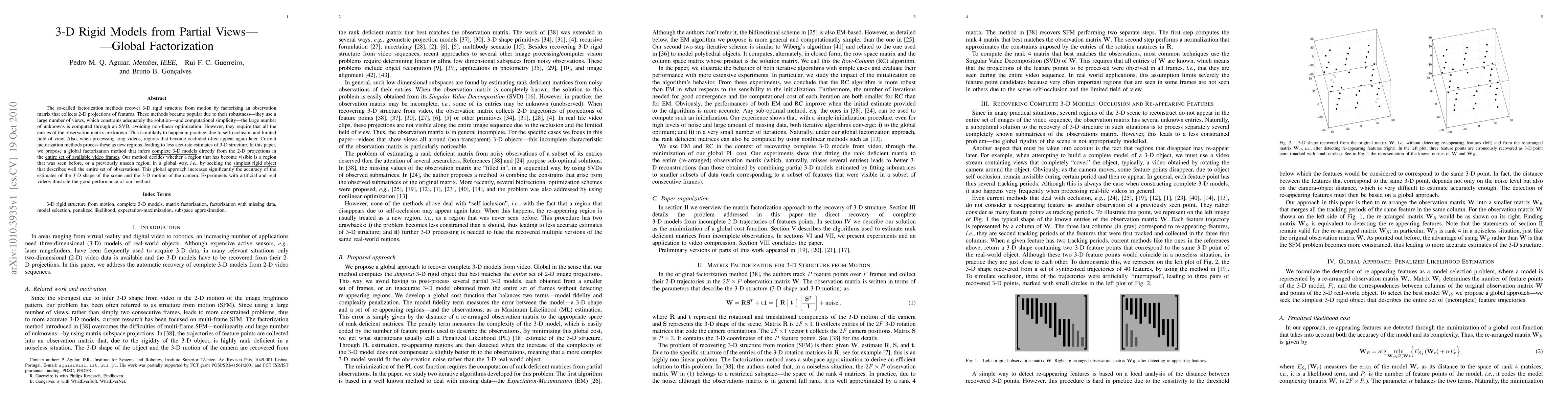 The so-called factorization methods recover 3-D rigid structure from motion by factorizing an observation matrix that collects 2-D projections of features. These methods became popular due to their robustness - they use a large number of views, which constrains adequately the solution - and computational simplicity - the large number of unknowns is computed through an SVD, avoiding non-linear optimization. However, they require that all the entries of the observation matrix are known. This is unlikely to happen in practice, due to self-occlusion and limited field of view. Also, when processing long videos, regions that become occluded often appear again later. Current factorization methods process these as new regions, leading to less accurate estimates of 3-D structure. In this paper, we propose a global factorization method that infers complete 3-D models directly from the 2-D projections in the entire set of available video frames. Our method decides whether a region that has become visible is a region that was seen before, or a previously unseen region, in a global way, i.e., by seeking the simplest rigid object that describes well the entire set of observations. This global approach increases significantly the accuracy of the estimates of the 3-D shape of the scene and the 3-D motion of the camera. Experiments with artificial and real videos illustrate the good performance of our method.