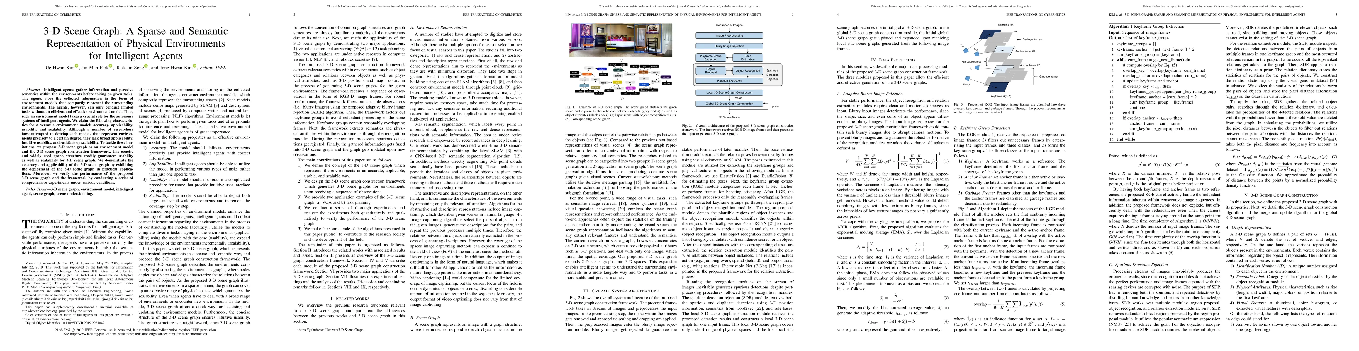 Intelligent agents gather information and perceive semantics within the environments before taking on given tasks. The agents store the collected information in the form of environment models that compactly represent the surrounding environments. The agents, however, can only conduct limited tasks without an efficient and effective environment model. Thus, such an environment model takes a crucial role for the autonomy systems of intelligent agents. We claim the following characteristics for a versatile environment model: accuracy, applicability, usability, and scalability. Although a number of researchers have attempted to develop such models that represent environments precisely to a certain degree, they lack broad applicability, intuitive usability, and satisfactory scalability. To tackle these limitations, we propose 3-D scene graph as an environment model and the 3-D scene graph construction framework. The concise and widely used graph structure readily guarantees usability as well as scalability for 3-D scene graph. We demonstrate the accuracy and applicability of the 3-D scene graph by exhibiting the deployment of the 3-D scene graph in practical applications. Moreover, we verify the performance of the proposed 3-D scene graph and the framework by conducting a series of comprehensive experiments under various conditions.