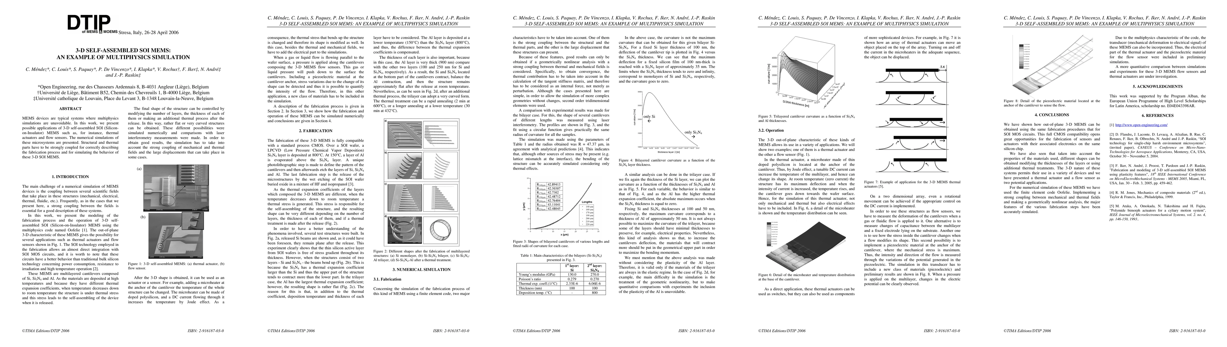 MEMS devices are typical systems where multiphysics simulations are unavoidable. In this work, we present possible applications of 3-D self-assembled SOI (Silicon-on-Insulator) MEMS such as, for instance, thermal actuators and flow sensors. The numerical simulations of these microsystems are presented. Structural and thermal parts have to be strongly coupled for correctly describing the fabrication process and for simulating the behavior of these 3-D SOI MEMS.