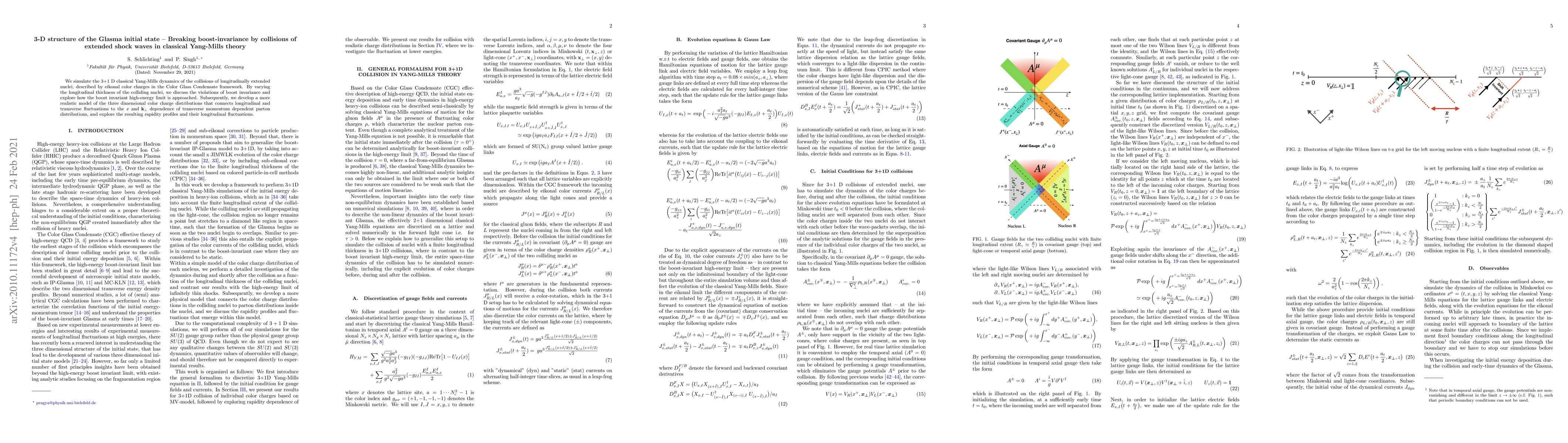 This paper simulates the 3+1 D classical Yang-Mills dynamics of extended nuclei collisions, exploring violations of boost invariance by varying the longitudinal thickness of the nuclei. It develops a model linking longitudinal and transverse fluctuations to parton distributions, analyzing the resulting rapidity profiles and fluctuations.