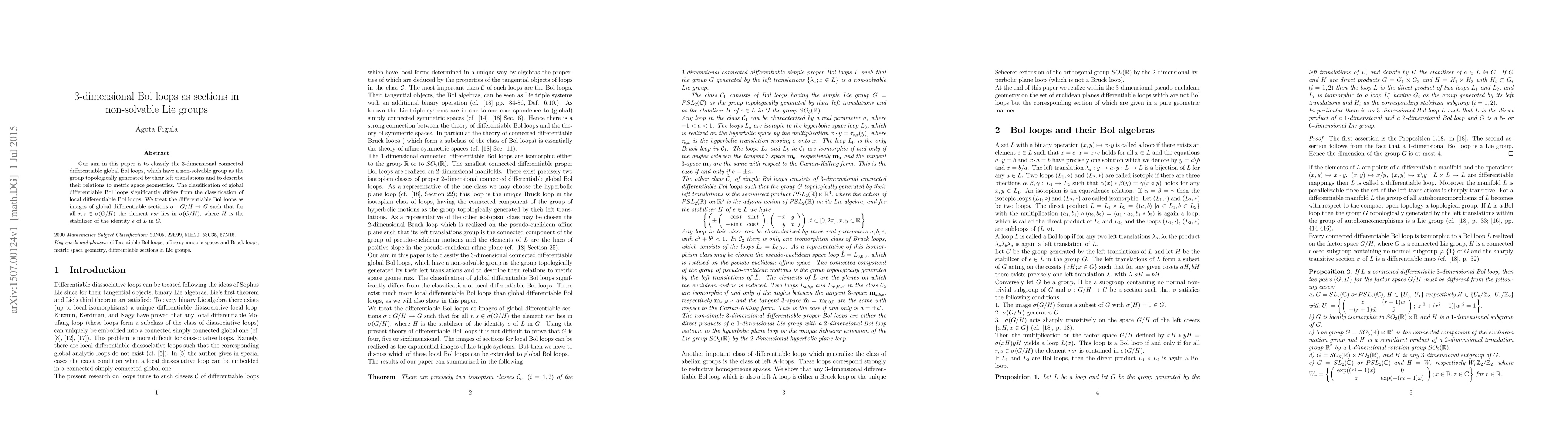 Our aim in this paper is to classify the $3$-dimensional connected differentiable global Bol loops, which have a non-solvable group as the group topologically generated by their left translations and to describe their relations to metric space geometries. The classification of global differentiable Bol loops significantly differs from the classification of local differentiable Bol loops. We treat the differentiable Bol loops as images of global differentiable sections $\sigma :G/H \to G$ such that for all $r,s \in \sigma (G/H)$ the element $rsr$ lies in $\sigma (G/H)$, where $H$ is the stabilizer of the identity $e$ of $L$ in $G$.