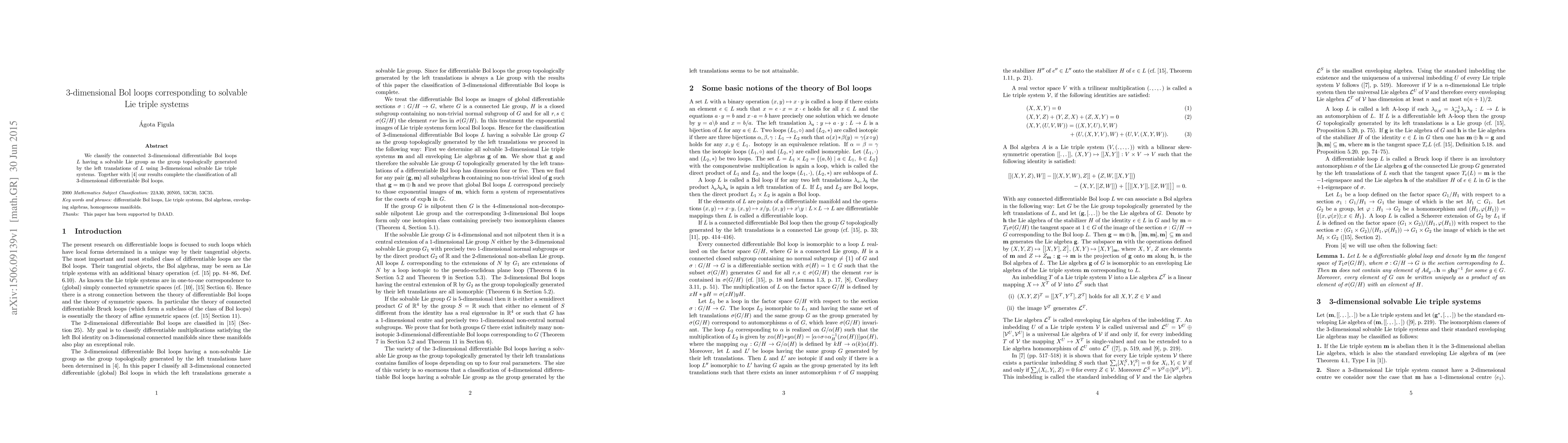 This paper classifies connected $3$-dimensional Bol loops with solvable Lie groups generated by left translations, utilizing $3$-dimensional solvable Lie triple systems, thus completing the classification of all such Bol loops.