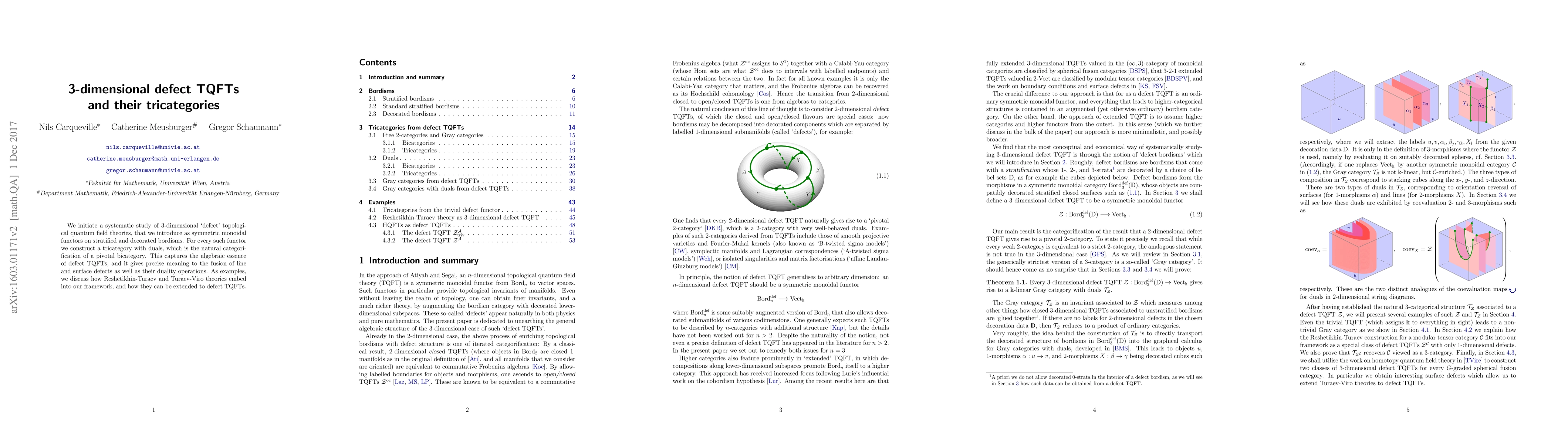 This paper explores 3-dimensional defect topological quantum field theories (TQFTs) as symmetric monoidal functors on stratified and decorated bordisms, constructing tricategories with duals that capture their algebraic essence. It provides a framework that precisely defines the fusion and duality of line and surface defects, exemplified by embedding Reshetikhin-Turaev and Turaev-Viro theories.