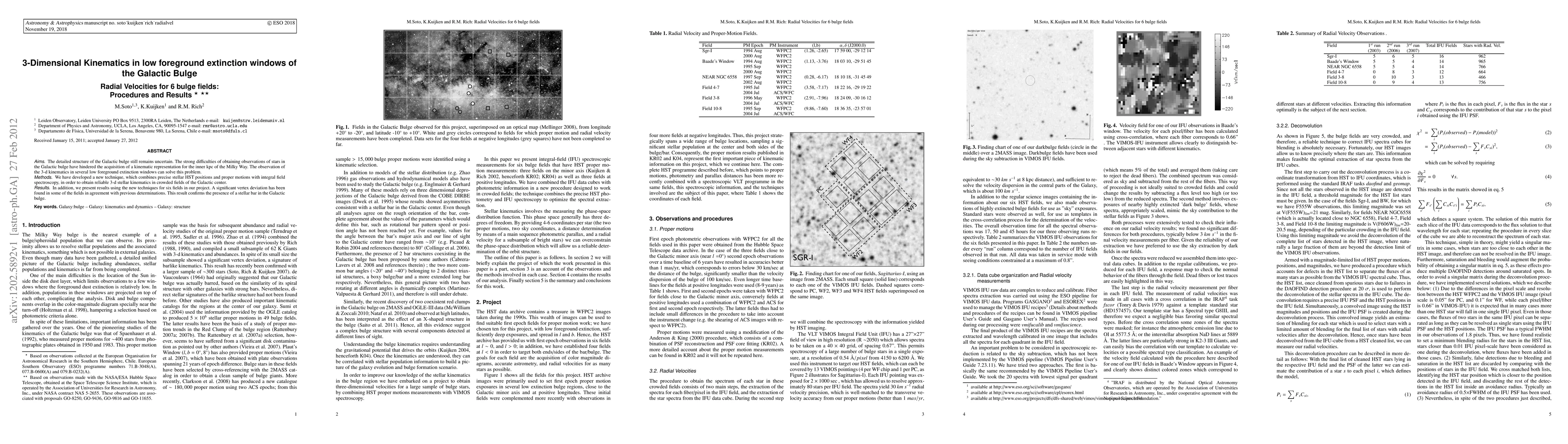 The detailed structure of the Galactic bulge still remain uncertain. The strong difficulties of obtaining observations of stars in the Galactic bulge have hindered the acquisition of a kinematic representation for the inner kpc of the Milky Way. The observation of the 3-d kinematics in several low foreground extinction windows can solve this problem. We have developed a new technique, which combines precise stellar HST positions and proper motions with integral field spectroscopy, in order to obtain reliable 3-d stellar kinematics in crowded fields of the Galactic center. In addition, we present results using the new techniques for six fields in our project. A significant vertex deviation has been found in some of the fields in agreement with previous determinations. This result confirms the presence of a stellar bar in the Galactic bulge.