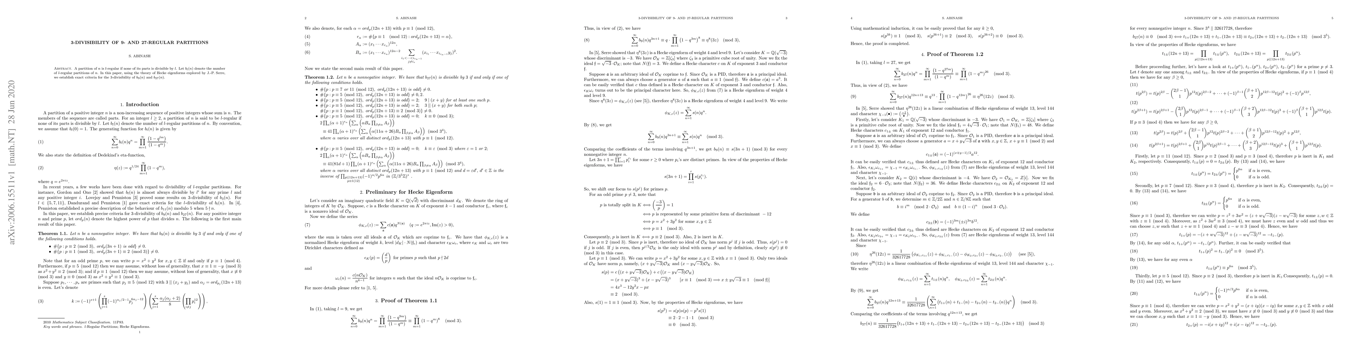 This paper establishes exact criteria for the $3$-divisibility of $b_9(n)$ and $b_{27}(n)$, which denote the number of $9$- and $27$-regular partitions of $n$, respectively, using the theory of Hecke eigenforms.