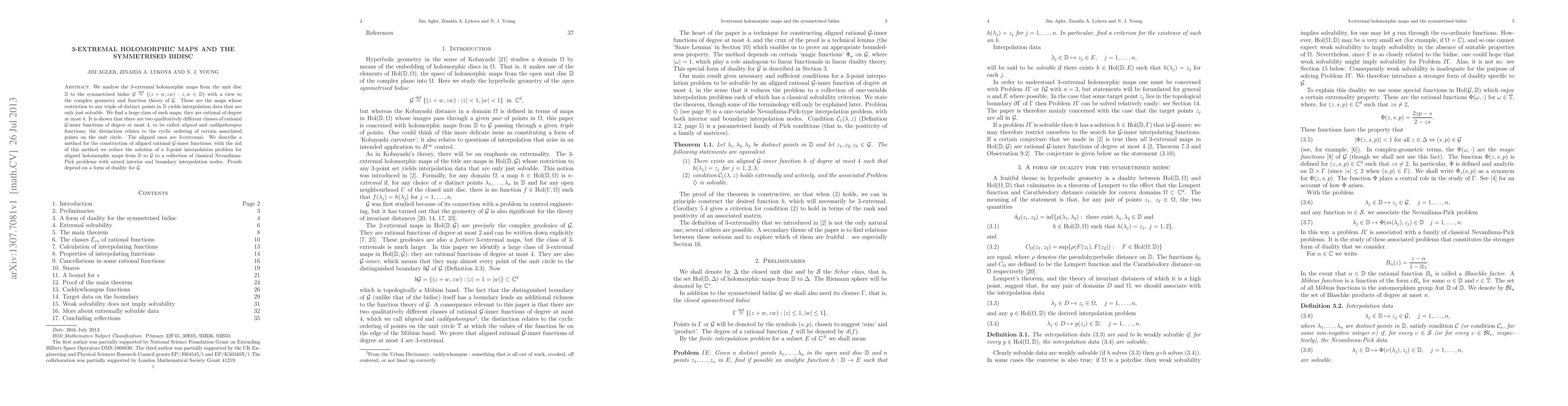 We analyse the 3-extremal holomorphic maps from the unit disc $\mathbb{D}$ to the symmetrised bidisc $ \mathcal{G}$, defined to be the set $ \{(z+w,zw): z,w\in\mathbb{D}\}$, with a view to the complex geometry and function theory of $\mathcal{G}$. These are the maps whose restriction to any triple of distinct points in $\mathbb{D}$ yields interpolation data that are only just solvable. We find a large class of such maps; they are rational of degree at most 4. It is shown that there are two qualitatively different classes of rational $\mathcal{G}$-inner functions of degree at most 4, to be called {\em aligned} and {\em caddywhompus} functions; the distinction relates to the cyclic ordering of certain associated points on the unit circle. The aligned ones are 3-extremal. We describe a method for the construction of aligned rational $\mathcal{G}$-inner functions; with the aid of this method we reduce the solution of a 3-point interpolation problem for aligned holomorphic maps from $\mathbb{D}$ to $\mathcal{G}$ to a collection of classical Nevanlinna-Pick problems with mixed interior and boundary interpolation nodes. Proofs depend on a form of duality for $\mathcal{G}$.