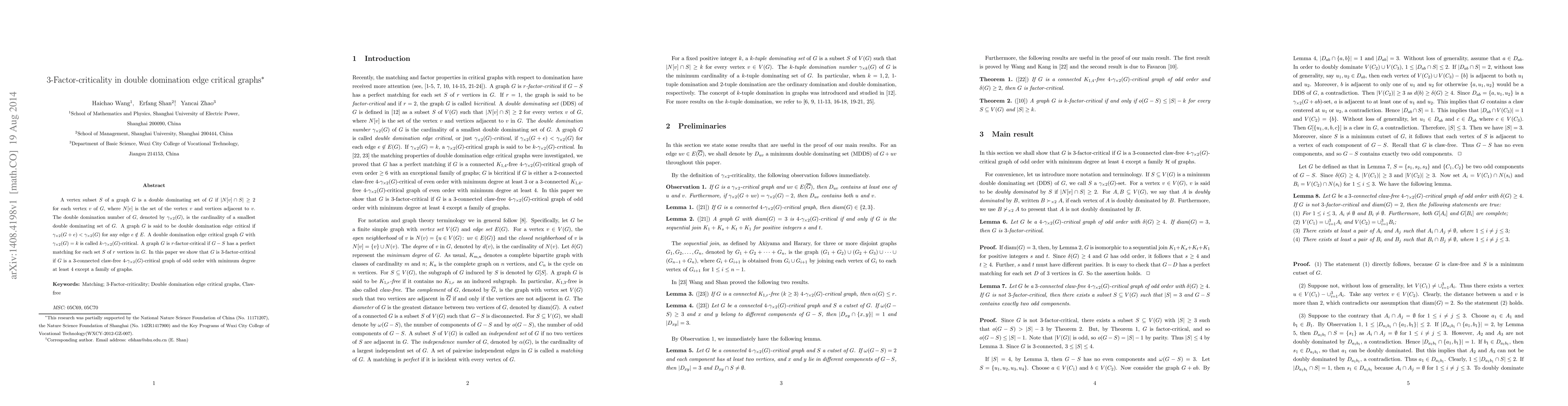 A vertex subset $S$ of a graph $G$ is a double dominating set of $G$ if $|N[v]\cap S|\geq 2$ for each vertex $v$ of $G$, where $N[v]$ is the set of the vertex $v$ and vertices adjacent to $v$. The double domination number of $G$, denoted by $\gamma_{\times 2}(G)$, is the cardinality of a smallest double dominating set of $G$. A graph $G$ is said to be double domination edge critical if $\gamma_{\times 2}(G+e)<\gamma_{\times 2}(G)$ for any edge $e \notin E$. A double domination edge critical graph $G$ with $\gamma_{\times 2}(G)=k$ is called $k$-$\gamma_{\times 2}(G)$-critical. A graph $G$ is $r$-factor-critical if $G-S$ has a perfect matching for each set $S$ of $r$ vertices in $G$. In this paper we show that $G$ is 3-factor-critical if $G$ is a 3-connected claw-free $4$-$\gamma_{\times 2}(G)$-critical graph of odd order with minimum degree at least 4 except a family of graphs.