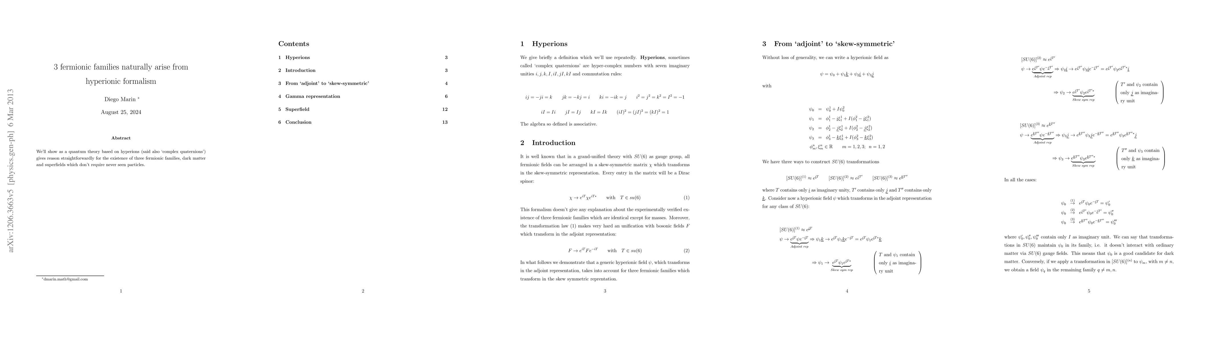 We'll show as a quantum theory based on hyperions (said also "complex quaternions") gives reason straightforwardly for the existence of three fermionic families, dark matter and superfields which don't require never seen particles.