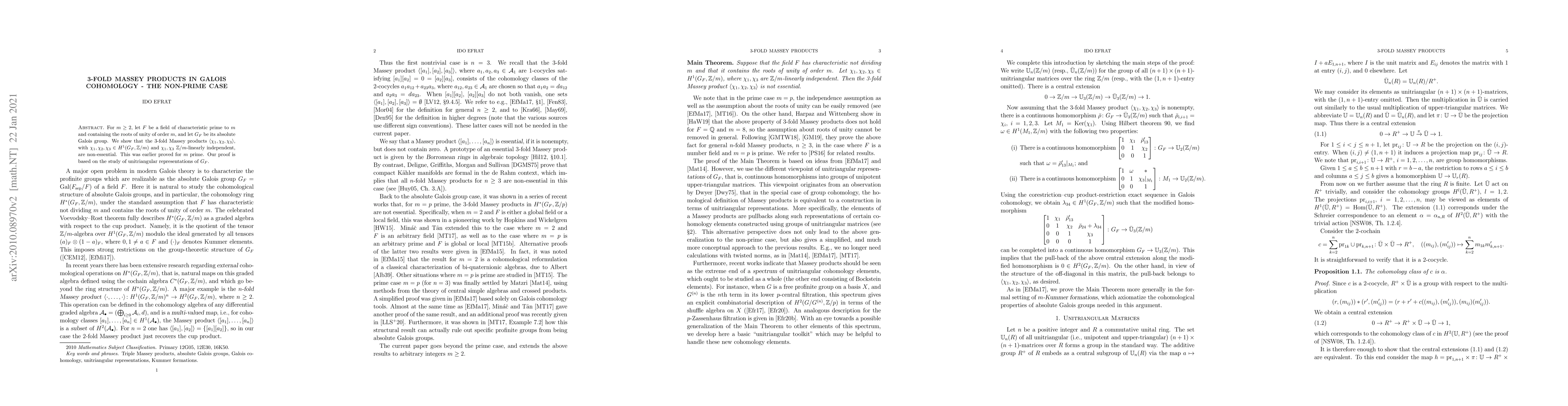 Summary: This paper investigates 3-fold Massey products in Galois cohomology for non-prime $m$, demonstrating that certain products involving specific cohomology classes are non-essential. The authors extend earlier results for prime $m$ using unitriangular representations of the Galois group.