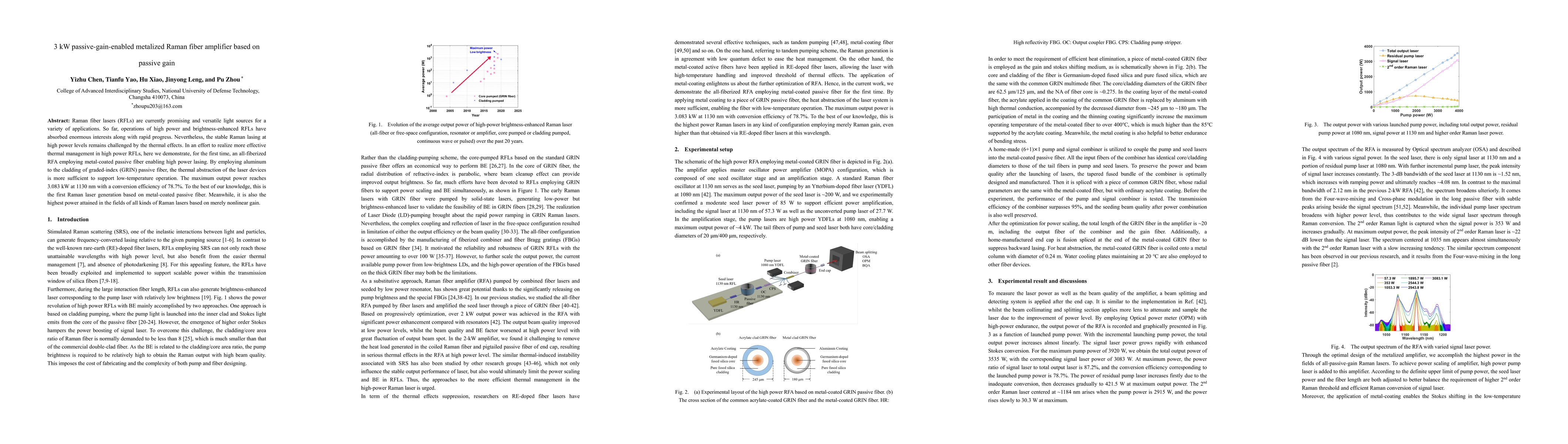 This paper presents a novel 3 kW passive-gain-enabled metalized Raman fiber amplifier based on metal-coated passive fiber, achieving high power lasing with effective thermal management. The aluminum-coated cladding of the graded-index fiber supports low-temperature operation, resulting in a maximum output power of 3.083 kW at 1130 nm with a conversion efficiency of 78.7%.