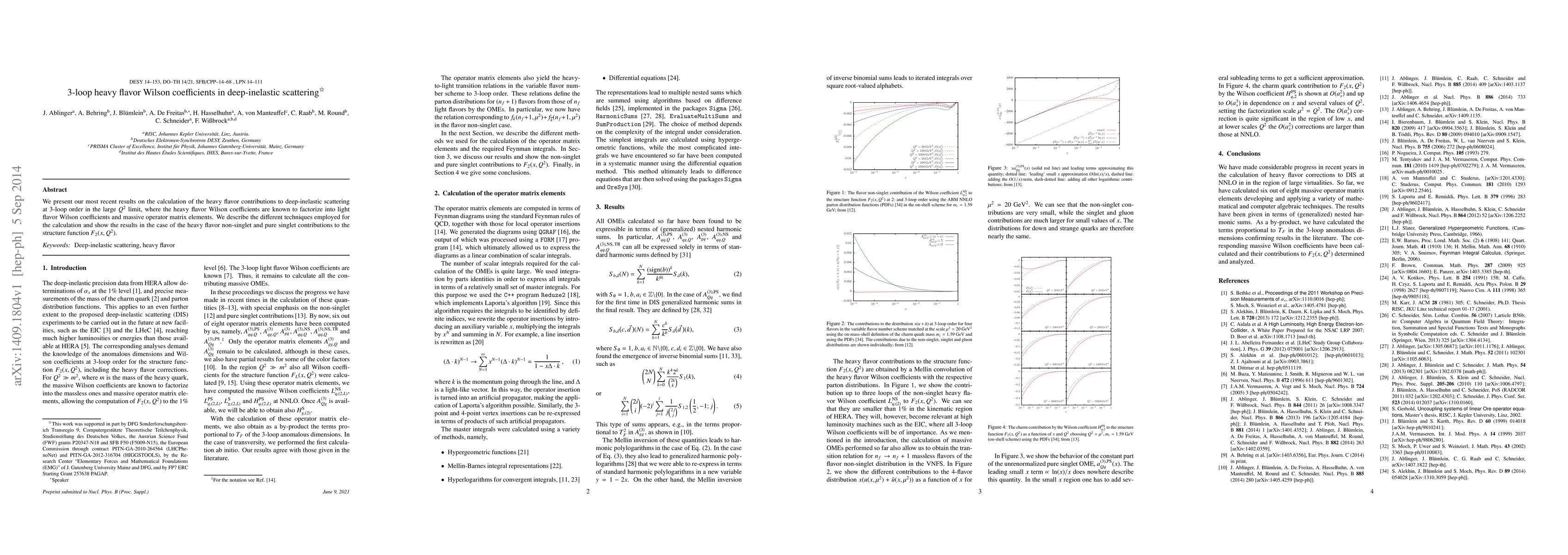 We present our most recent results on the calculation of the heavy flavor contributions to deep-inelastic scattering at 3-loop order in the large $Q^2$ limit, where the heavy flavor Wilson coefficients are known to factorize into light flavor Wilson coefficients and massive operator matrix elements. We describe the different techniques employed for the calculation and show the results in the case of the heavy flavor non-singlet and pure singlet contributions to the structure function $F_2(x,Q^2)$.