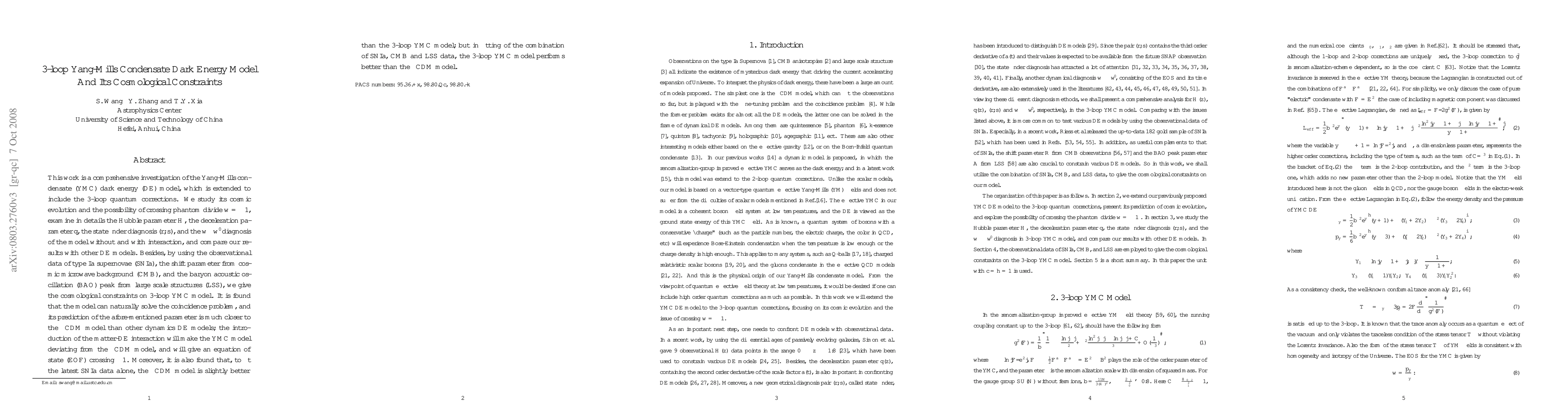 This work is a comprehensive investigation of the Yang-Mills condensate (YMC) dark energy (DE) model, which is extended to include the 3-loop quantum corrections. We study its cosmic evolution and the possibility of crossing phantom divide $w=-1$, examine in details the Hubble parameter $H$, the deceleration parameter $q$, the statefinder diagnosis $(r,s)$, and the $w-w^\prime$ diagnosis of the model without and with interaction, and compare our results with other DE models. Besides, by using the observational data of type Ia supernovae (SNIa), the shift parameter from cosmic microwave background (CMB), and the baryon acoustic oscillation (BAO) peak from large scale structures (LSS), we give the cosmological constraints on 3-loop YMC model. It is found that the model can naturally solve the coincidence problem, and its prediction of the afore-mentioned parameter is much closer to the $\Lambda$CDM model than other dynamics DE models; the introduction of the matter-DE interaction will make the YMC model deviating from the $\Lambda$CDM model, and will give an equation of state (EOF) crossing -1. Moreover, it is also found that, to fit the latest SNIa data alone, the $\Lambda$CDM model is slightly better than the 3-loop YMC model; but in fitting of the combination of SNIa, CMB and LSS data, the 3-loop YMC model performs better than the $\Lambda$CDM model.