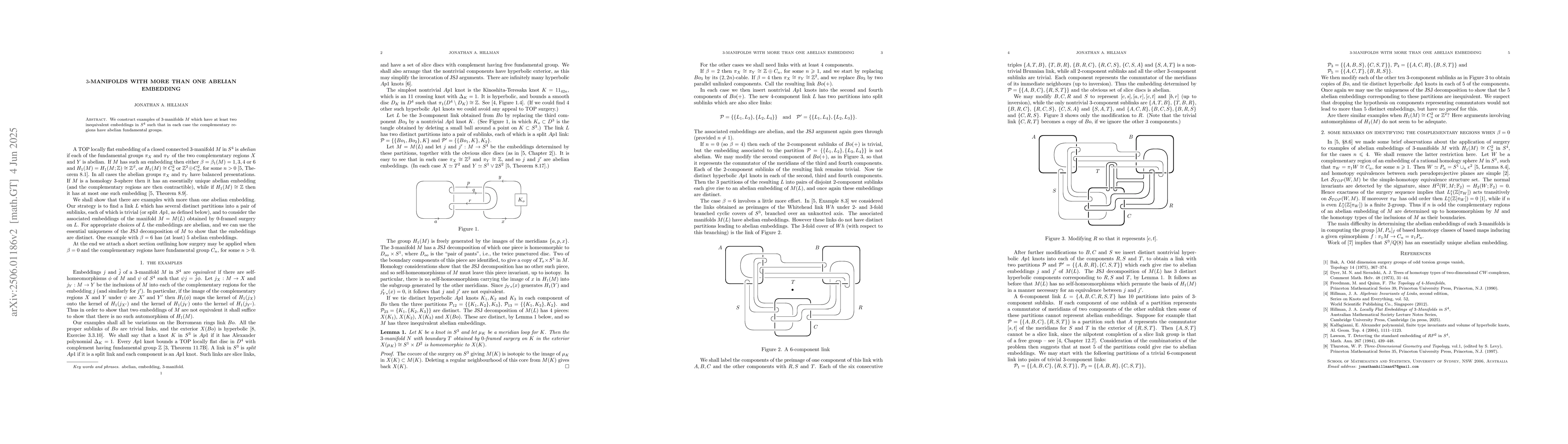 This work extends previous research by explicitly constructing 3-manifolds with more than one abelian embedding, a case not previously addressed in the literature.