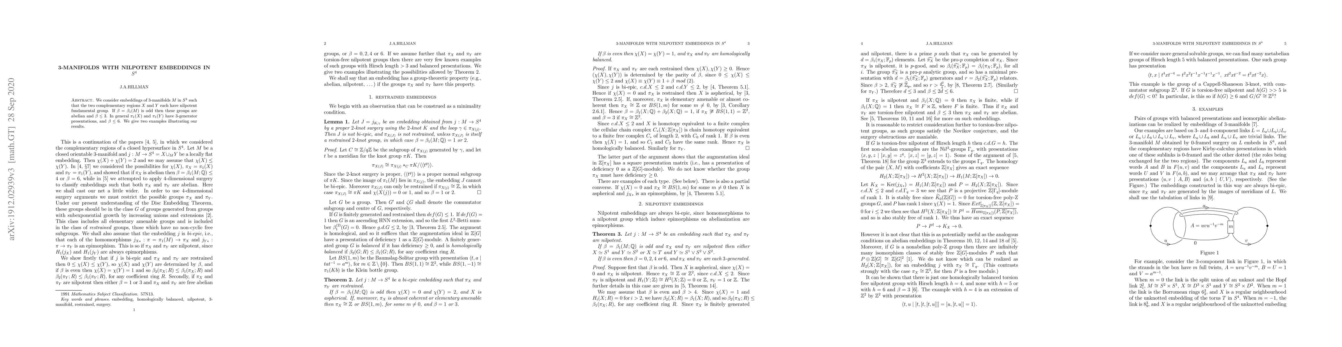 We consider embeddings of 3-manifolds $M$ in $S^4$ such that the two complementary regions $X$ and $Y$ each have nilpotent fundamental group. If $\beta=\beta_1(M)$ is odd then these groups are abelian and $\beta\leq3$. In general, $\pi_1(X)$ and $\pi_1(Y)$ have 3-generator presentations, and $\beta\leq6$. We determine all such nilpotent groups which are torsion-free and have Hirsch length $\leq5$.