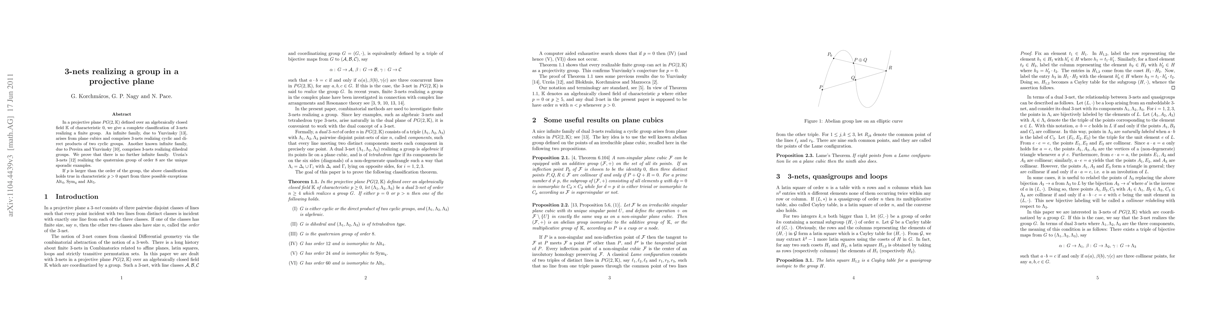 This paper classifies 3-nets in projective planes that realize finite groups, identifying infinite families from plane cubics and dihedral groups, and proving no further infinite families exist. Urzua's 3-nets for the quaternion group are the only sporadic examples, with similar classifications holding in positive characteristic fields except for exceptions Alt_4, Sym_4, and Alt_5.